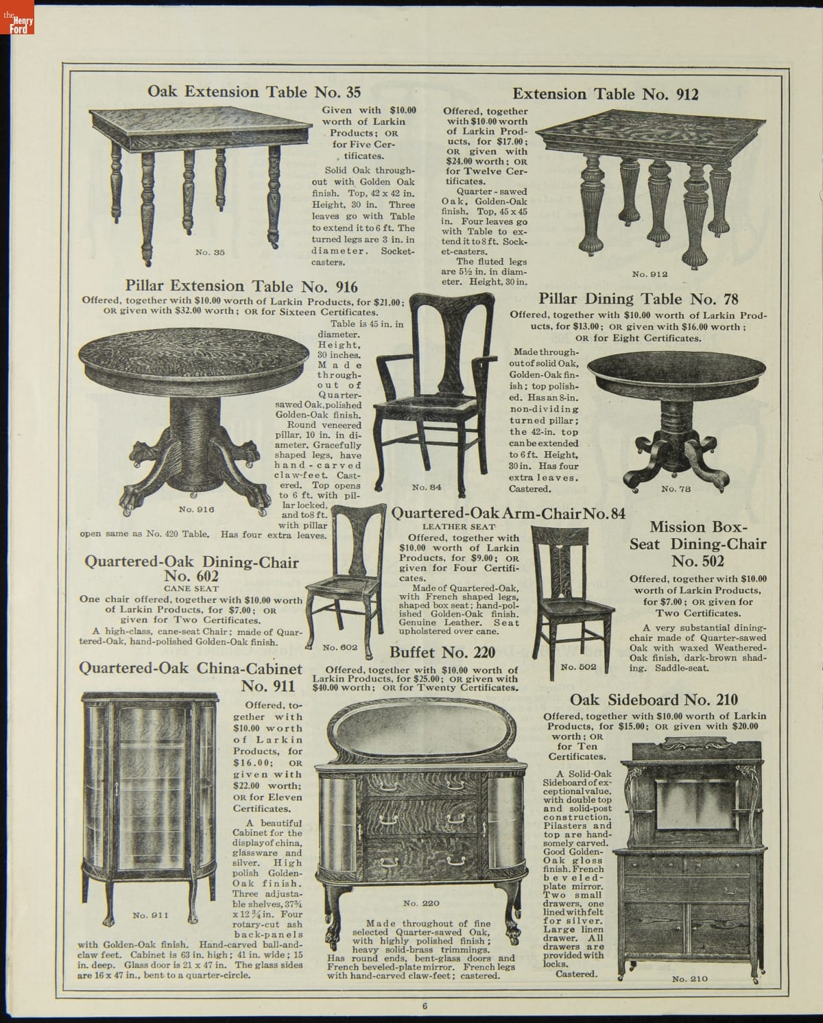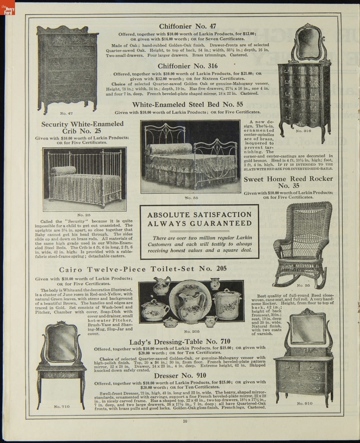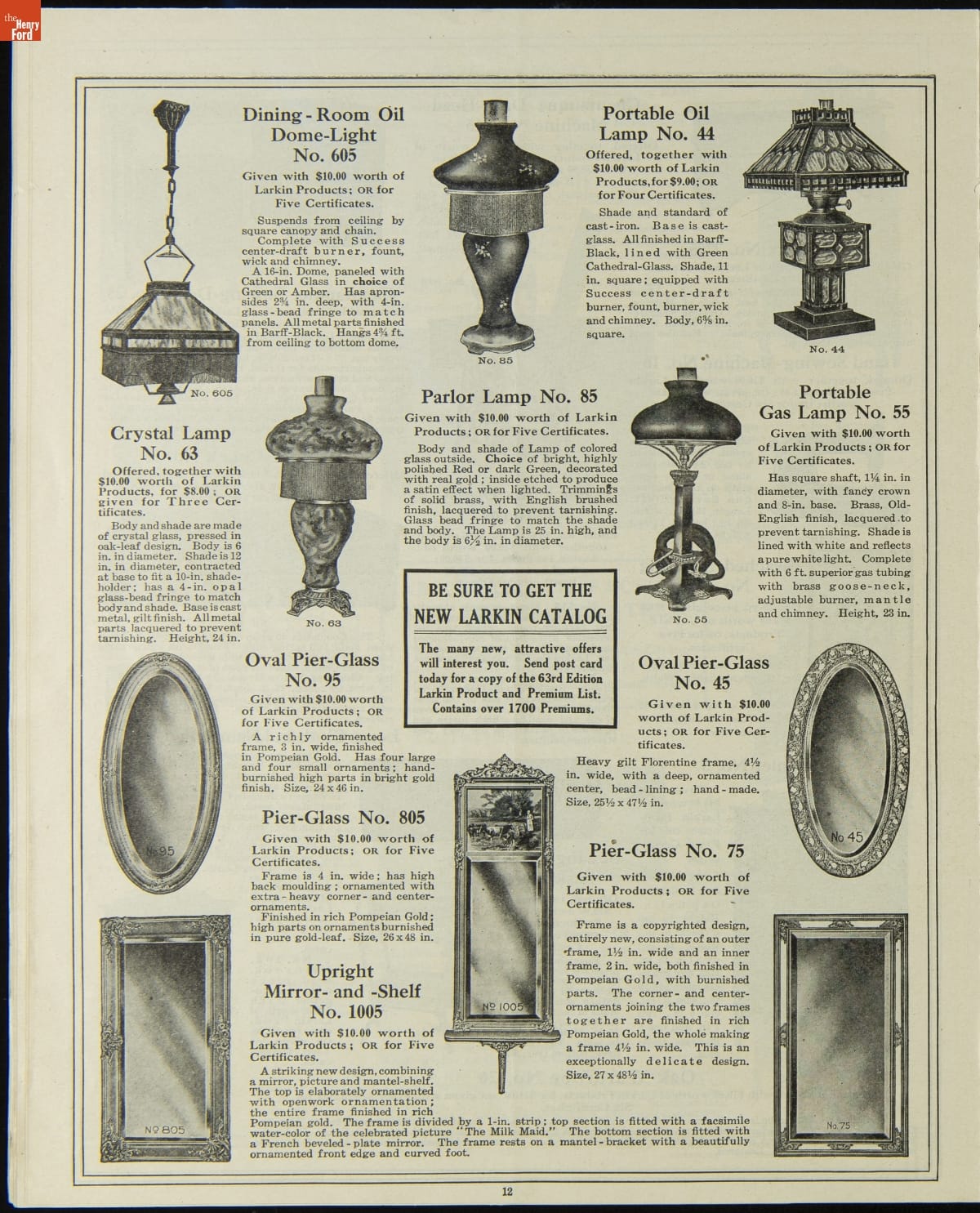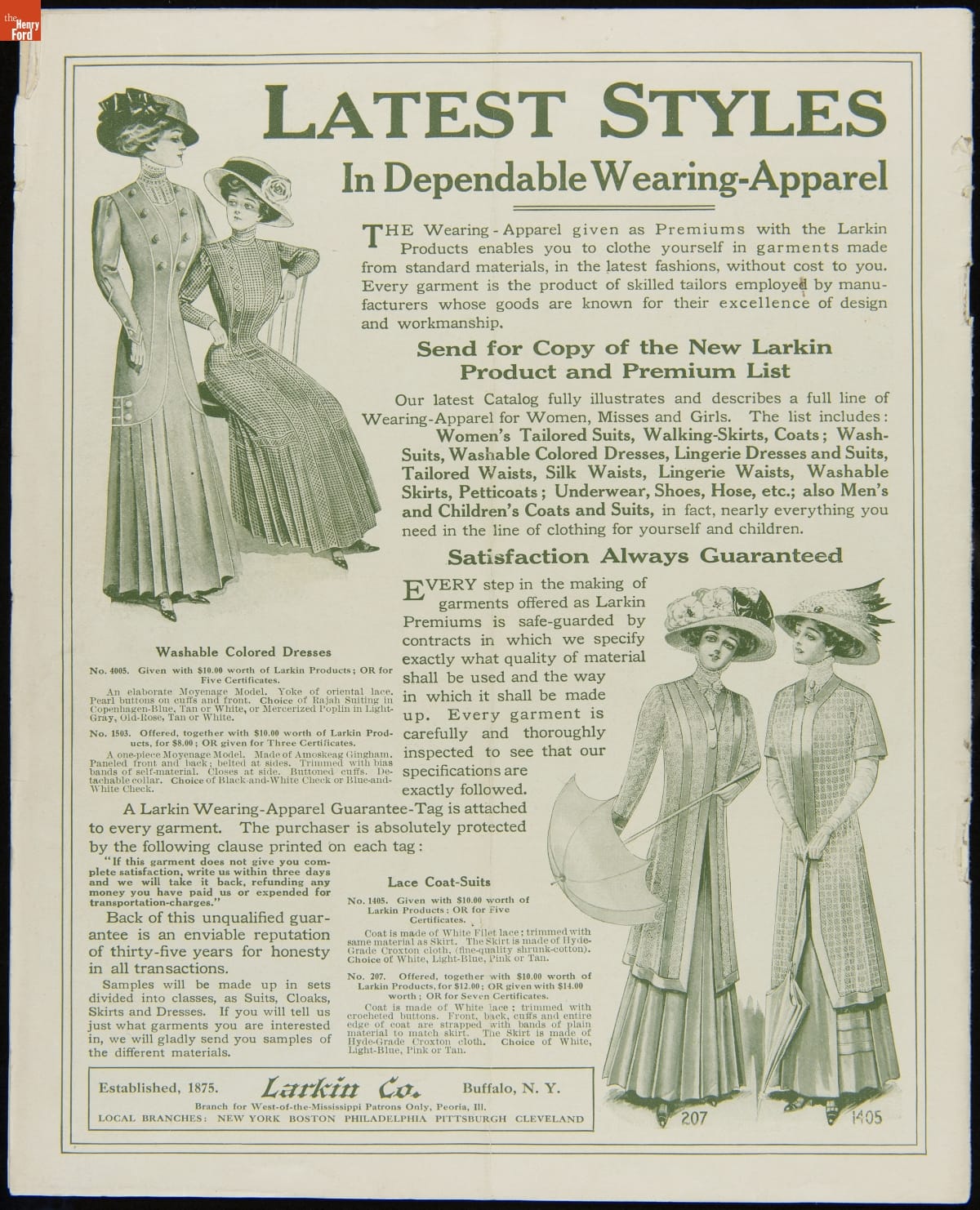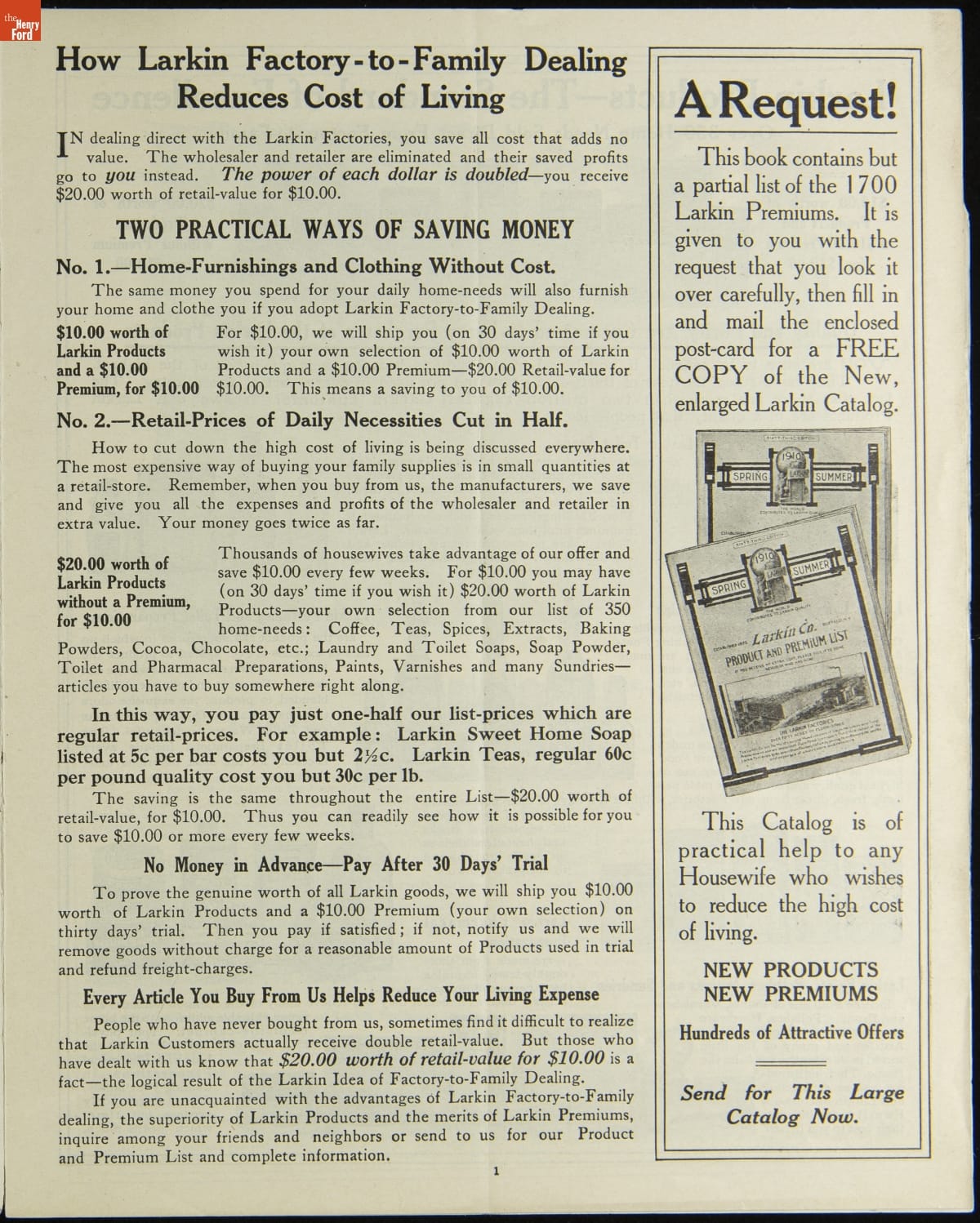 John D. Larkin established a soap manufacturing company in 1875. He hired his brother-in-law, Elbert Hubbard, as a salesman. Hubbard developed "The Larkin Idea," a plan that sold goods directly to consumers through mail-order catalogs and offered incentivizing giveaways. It was a success. By the early 1900s, Larkin's catalogs contained pages of products and even more pages of premiums from which customers could choose.