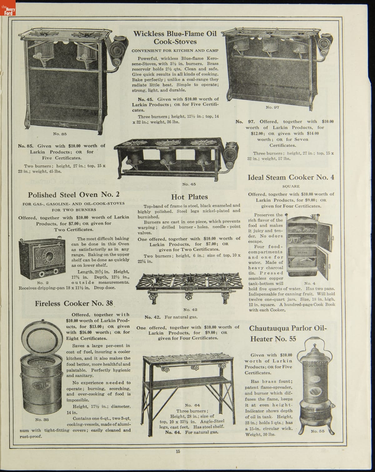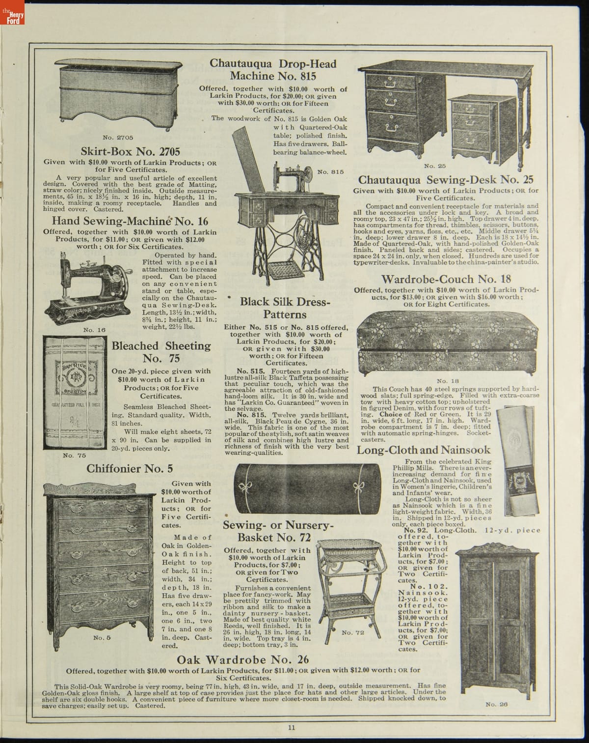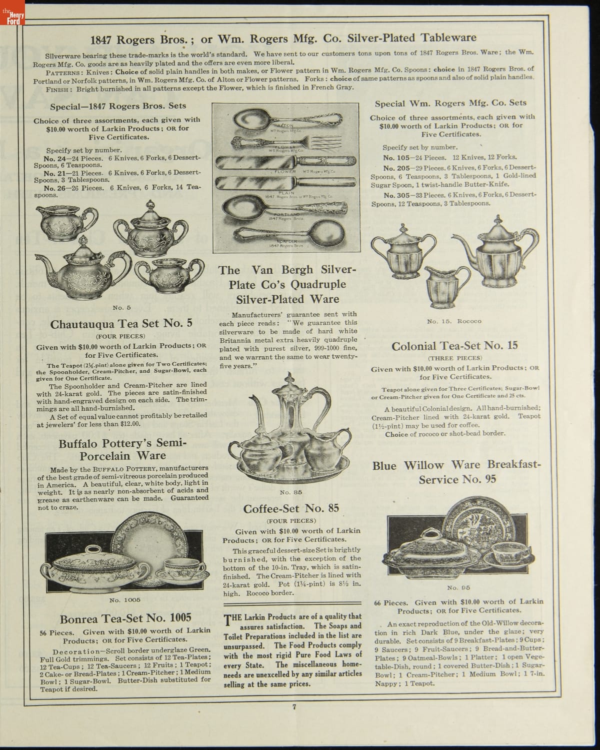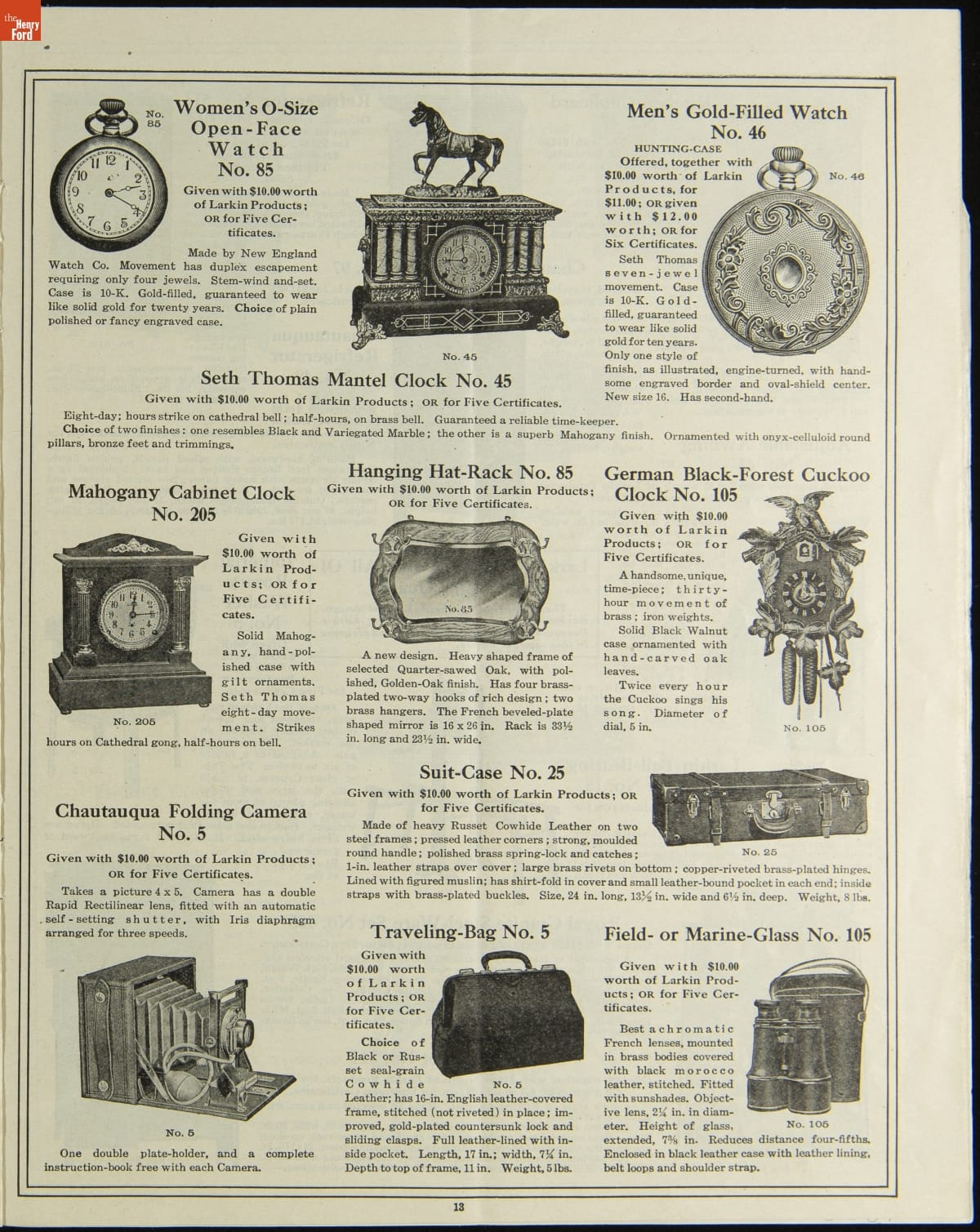 John D. Larkin established a soap manufacturing company in 1875. He hired his brother-in-law, Elbert Hubbard, as a salesman. Hubbard developed "The Larkin Idea," a plan that sold goods directly to consumers through mail-order catalogs and offered incentivizing giveaways. It was a success. By the early 1900s, Larkin's catalogs contained pages of products and even more pages of premiums from which customers could choose.