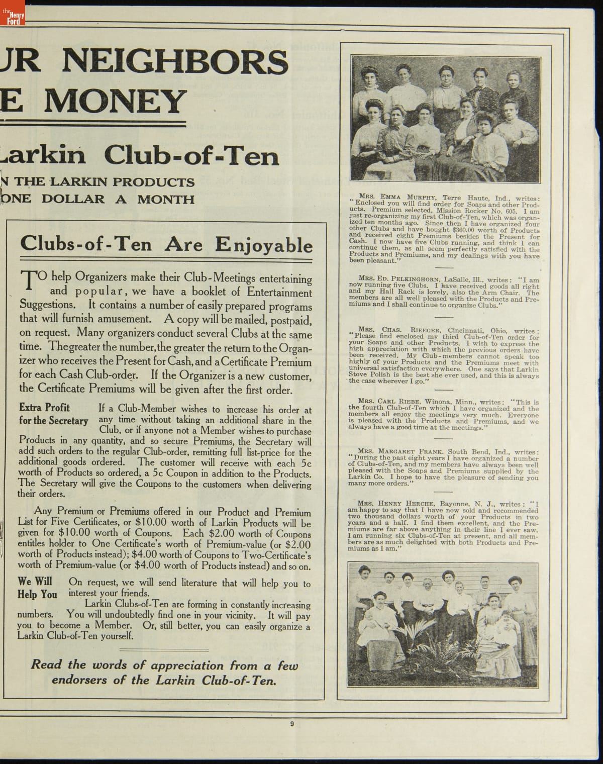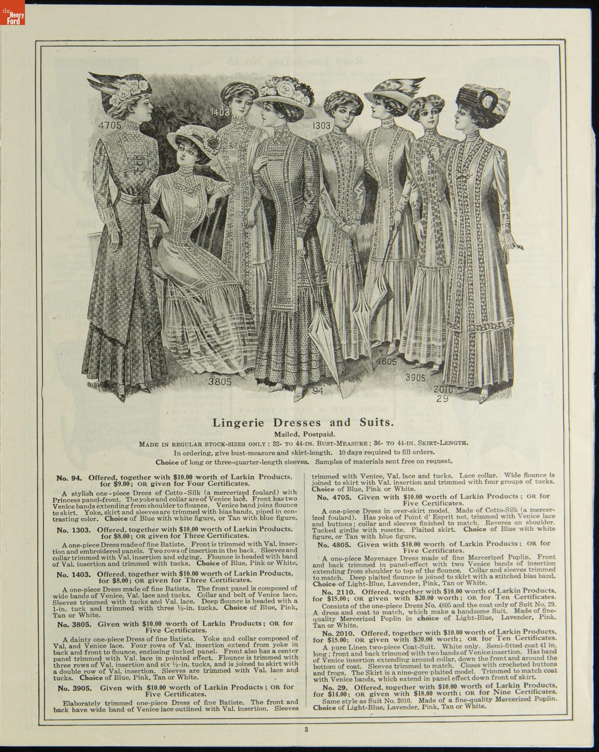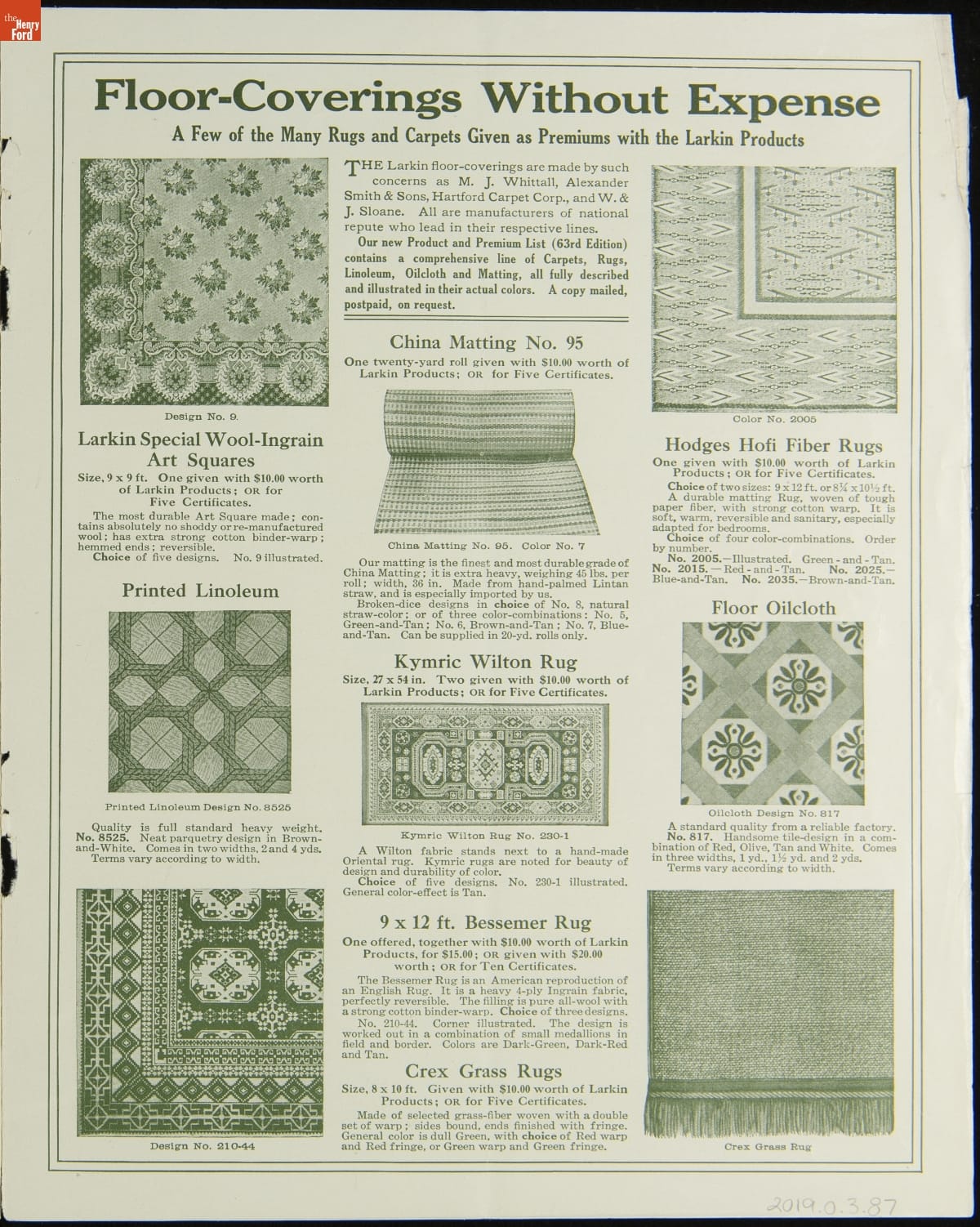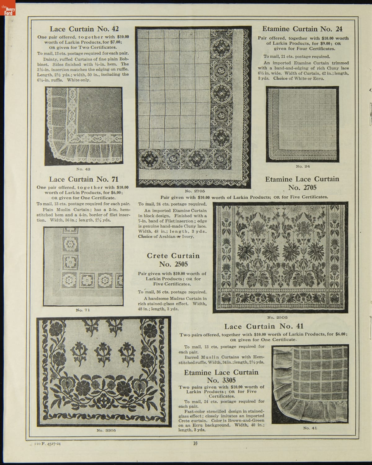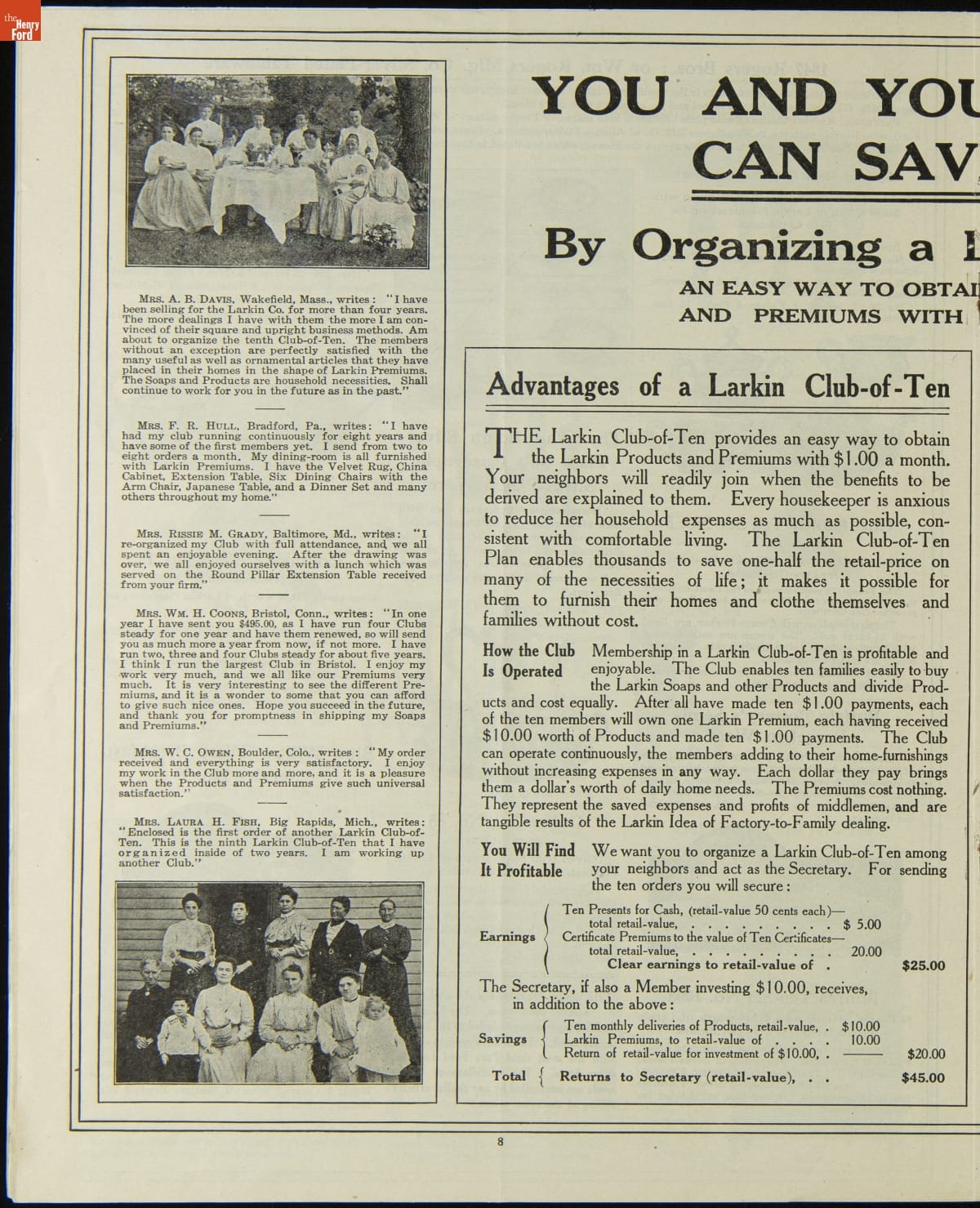 John D. Larkin established a soap manufacturing company in 1875. He hired his brother-in-law, Elbert Hubbard, as a salesman. Hubbard developed "The Larkin Idea," a plan that sold goods directly to consumers through mail-order catalogs and offered incentivizing giveaways. It was a success. By the early 1900s, Larkin's catalogs contained pages of products and even more pages of premiums from which customers could choose.