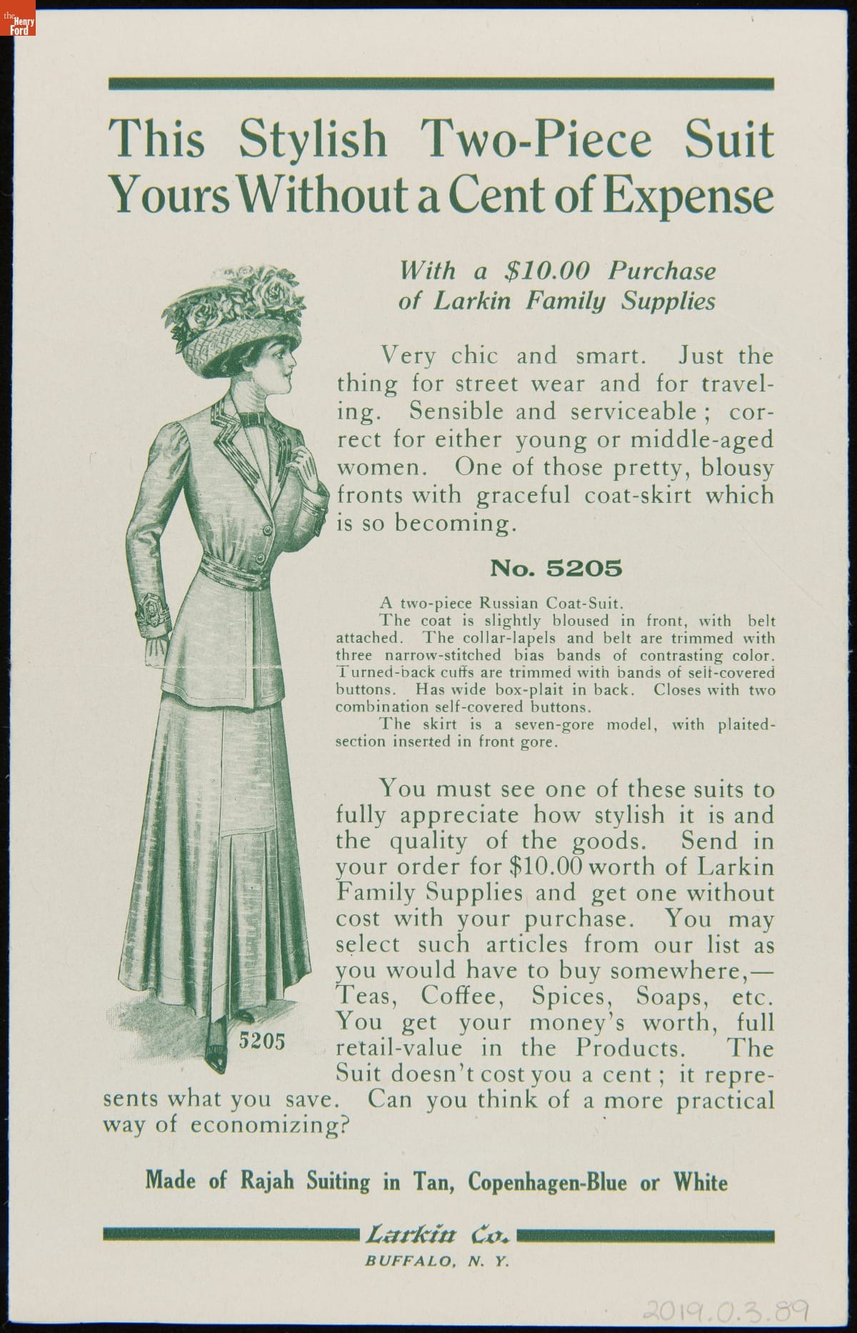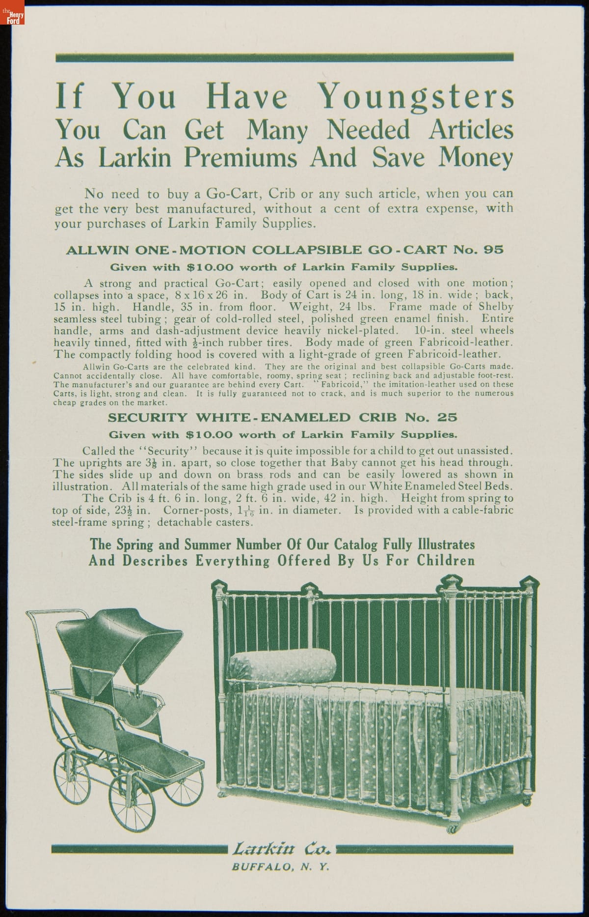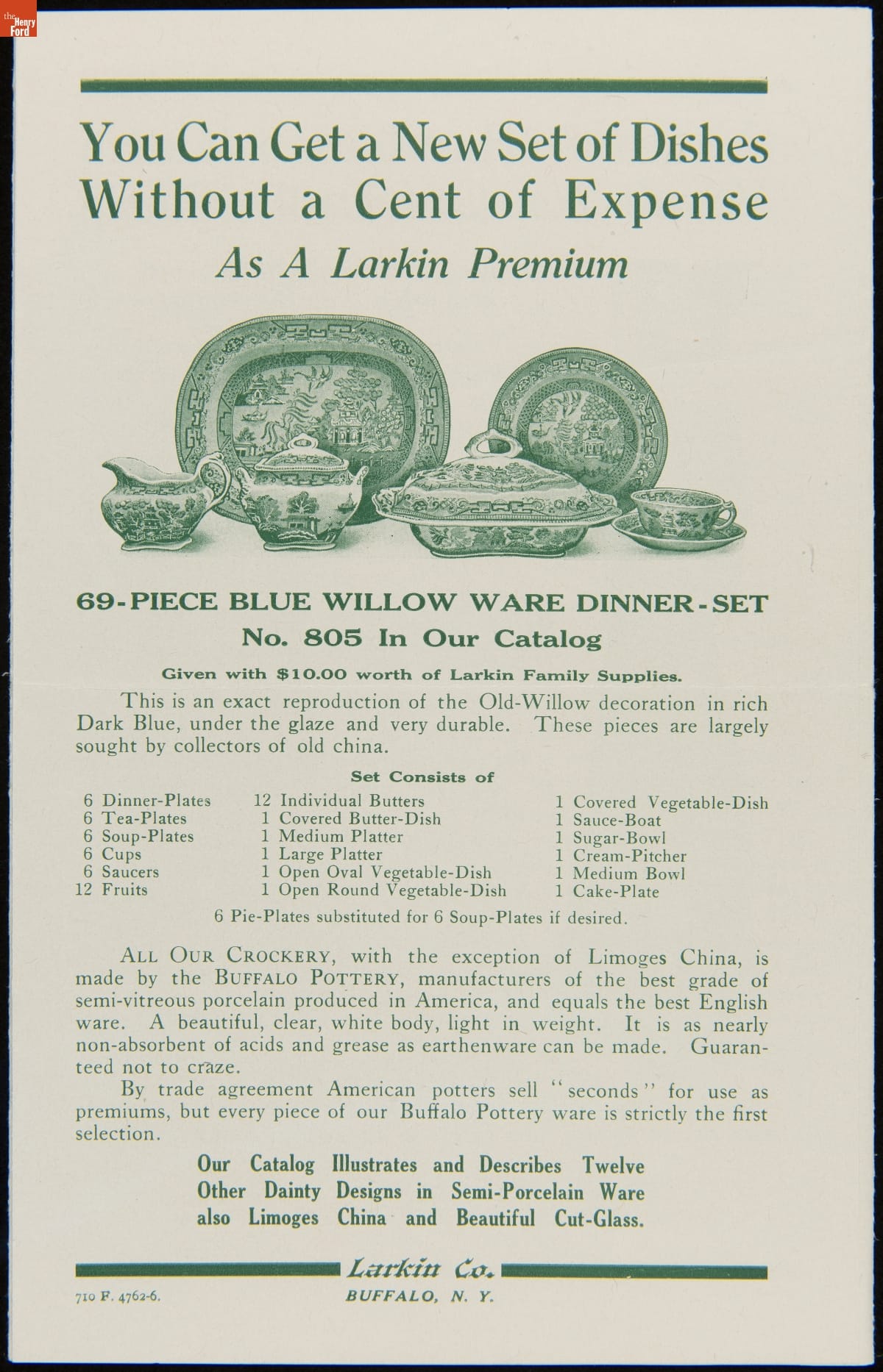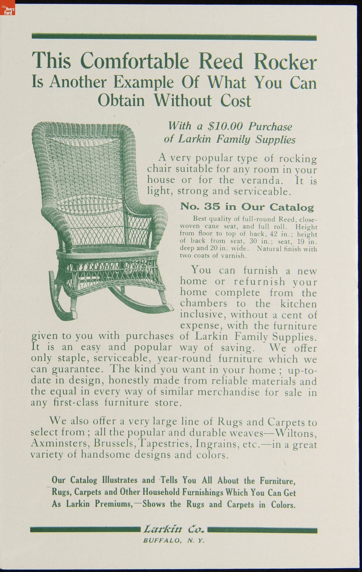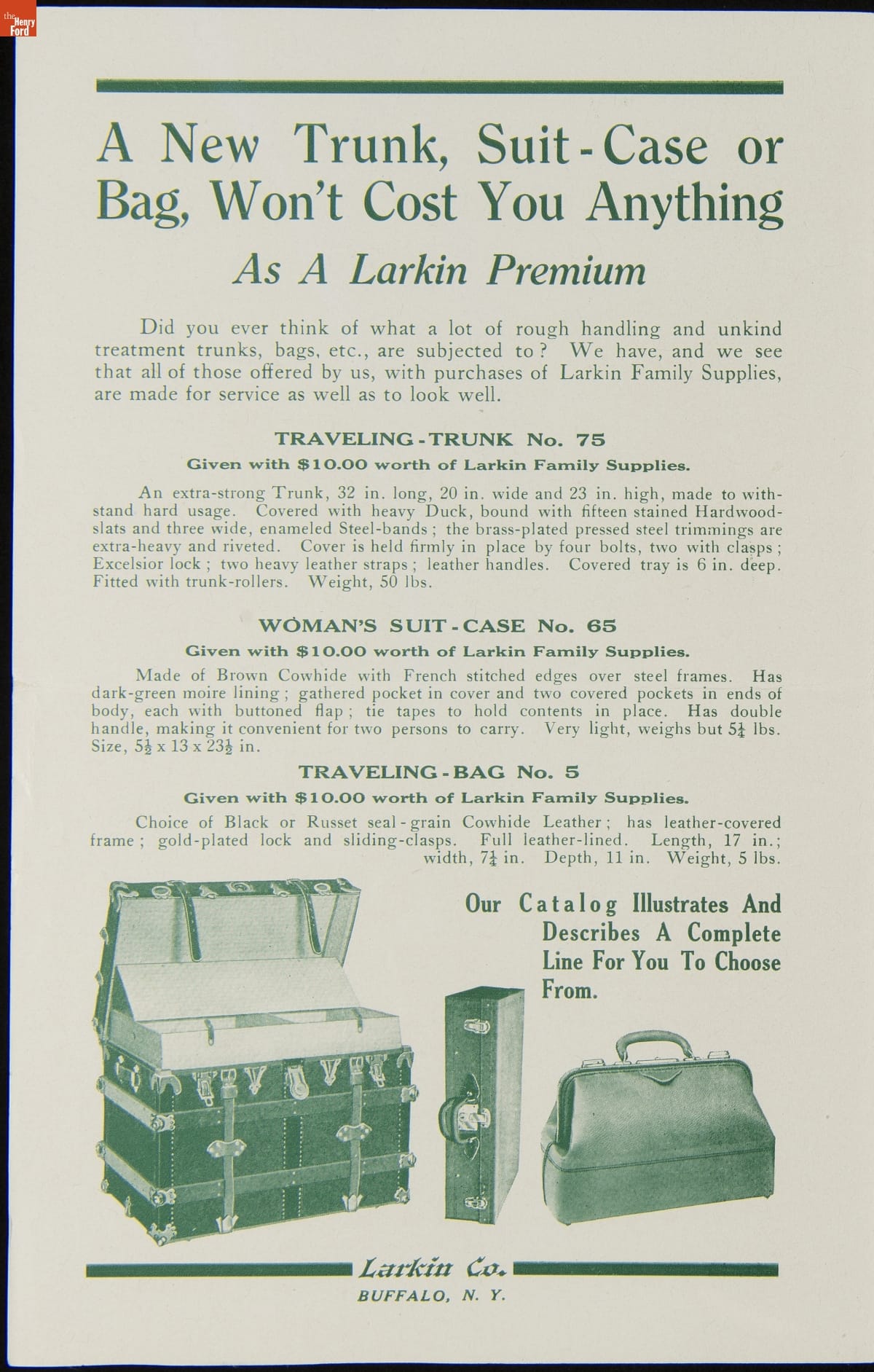 John D. Larkin established a soap manufacturing company in 1875. He hired his brother-in-law, Elbert Hubbard, as a salesman. Hubbard developed "The Larkin Idea," a plan that sold goods directly to consumers through mail-order catalogs and offered incentivizing giveaways. It was a success. By the early 1900s, Larkin's catalogs contained pages of products and even more pages of premiums from which customers could choose.