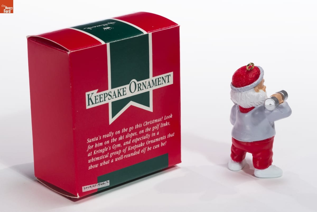 KEEPSAKE ORNAMENT / Santa's really on the go this Christmas! Look / for him on the ski slopes, on the golf links, / at Kringle's Gym, and especially in a / whimiscal group of Keepsake Ornaments that / show what a well-rounded elf he can be!