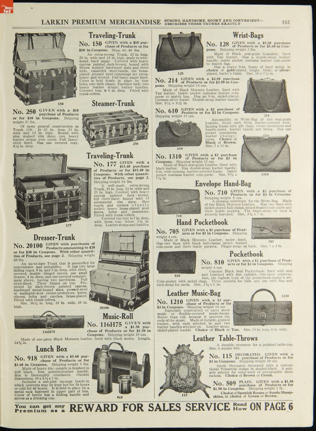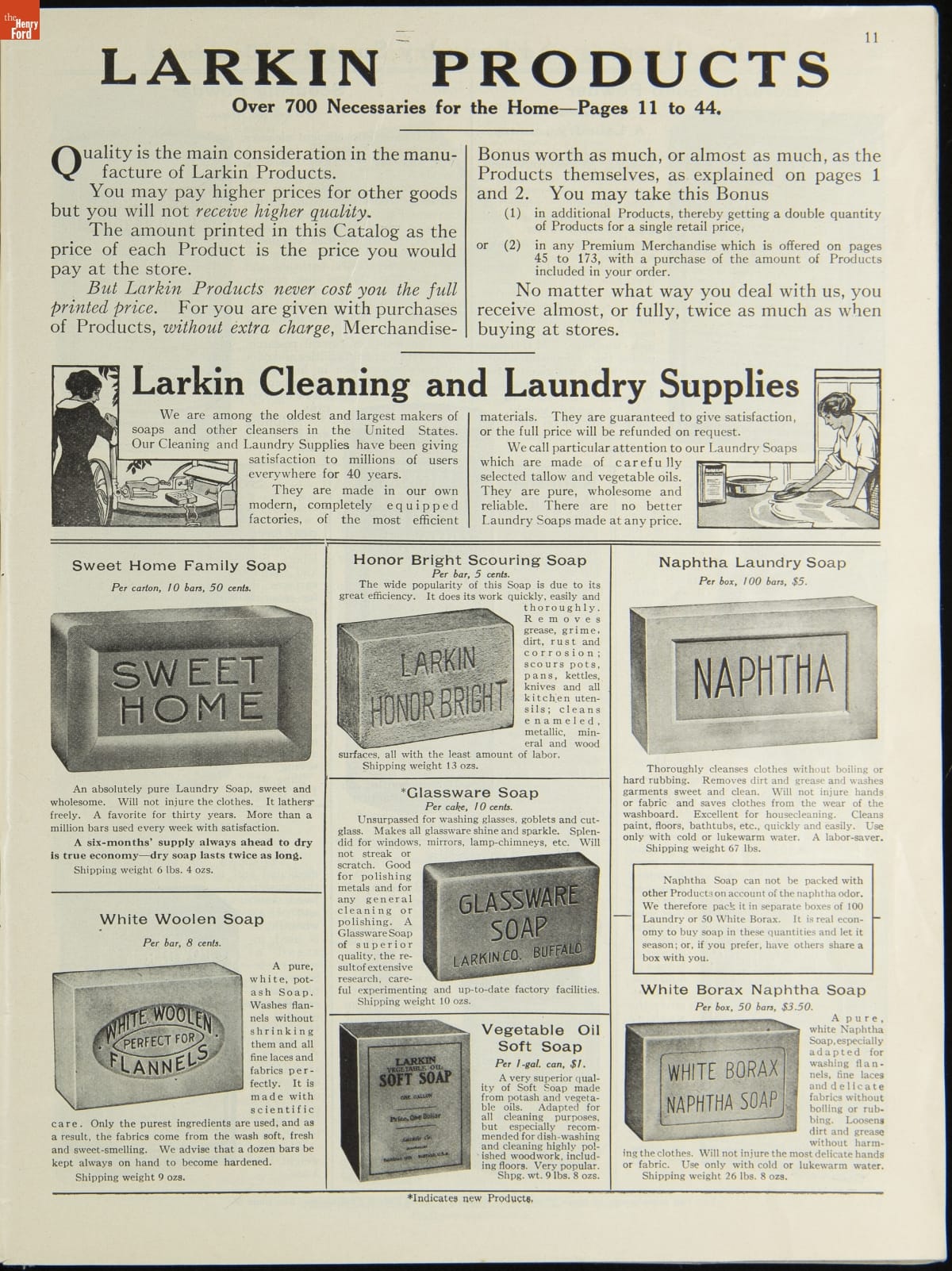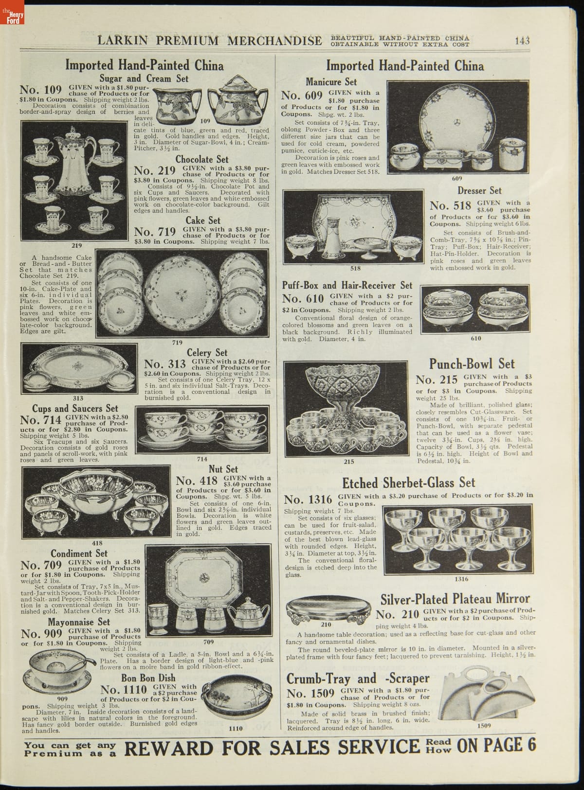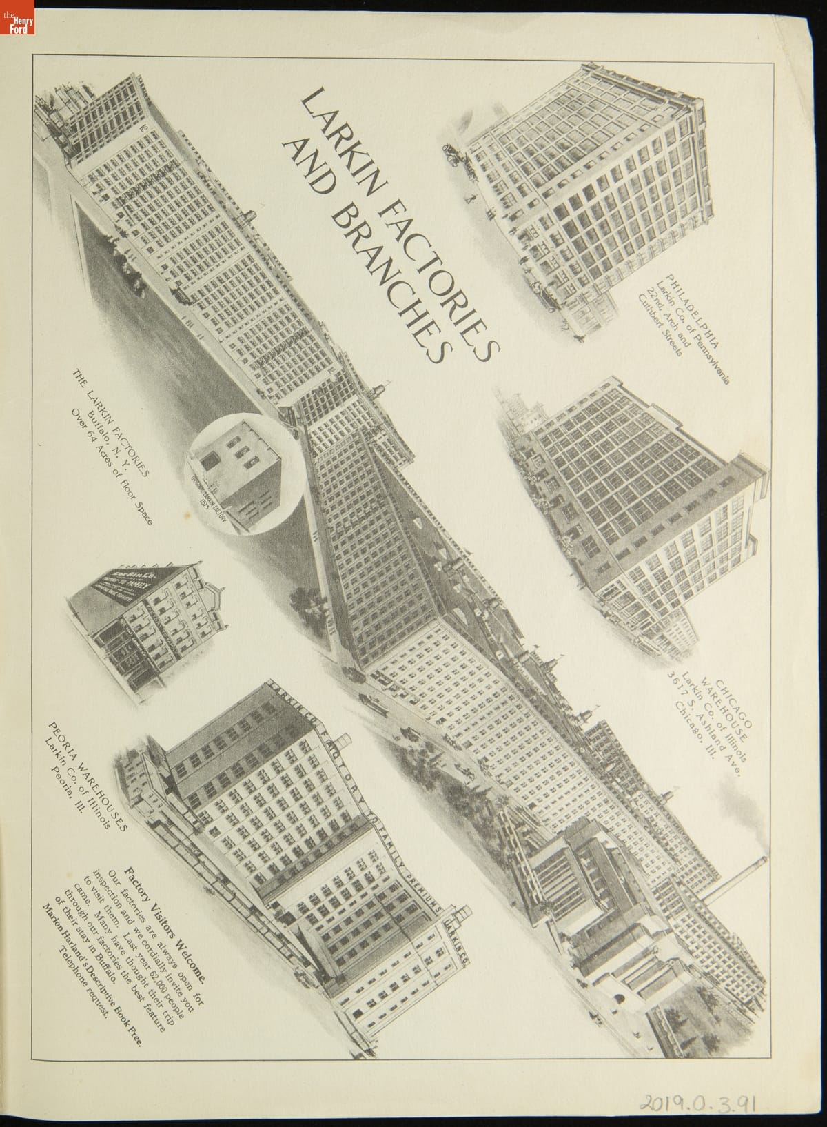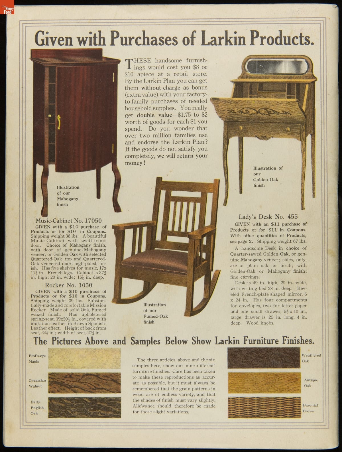 John D. Larkin established a soap manufacturing company in 1875. He hired his brother-in-law, Elbert Hubbard, as a salesman. Hubbard developed "The Larkin Idea," a plan that sold goods directly to consumers through mail-order catalogs and offered incentivizing giveaways. It was a success. By the early 1900s, Larkin's catalogs contained pages of products and even more pages of premiums from which customers could choose.
