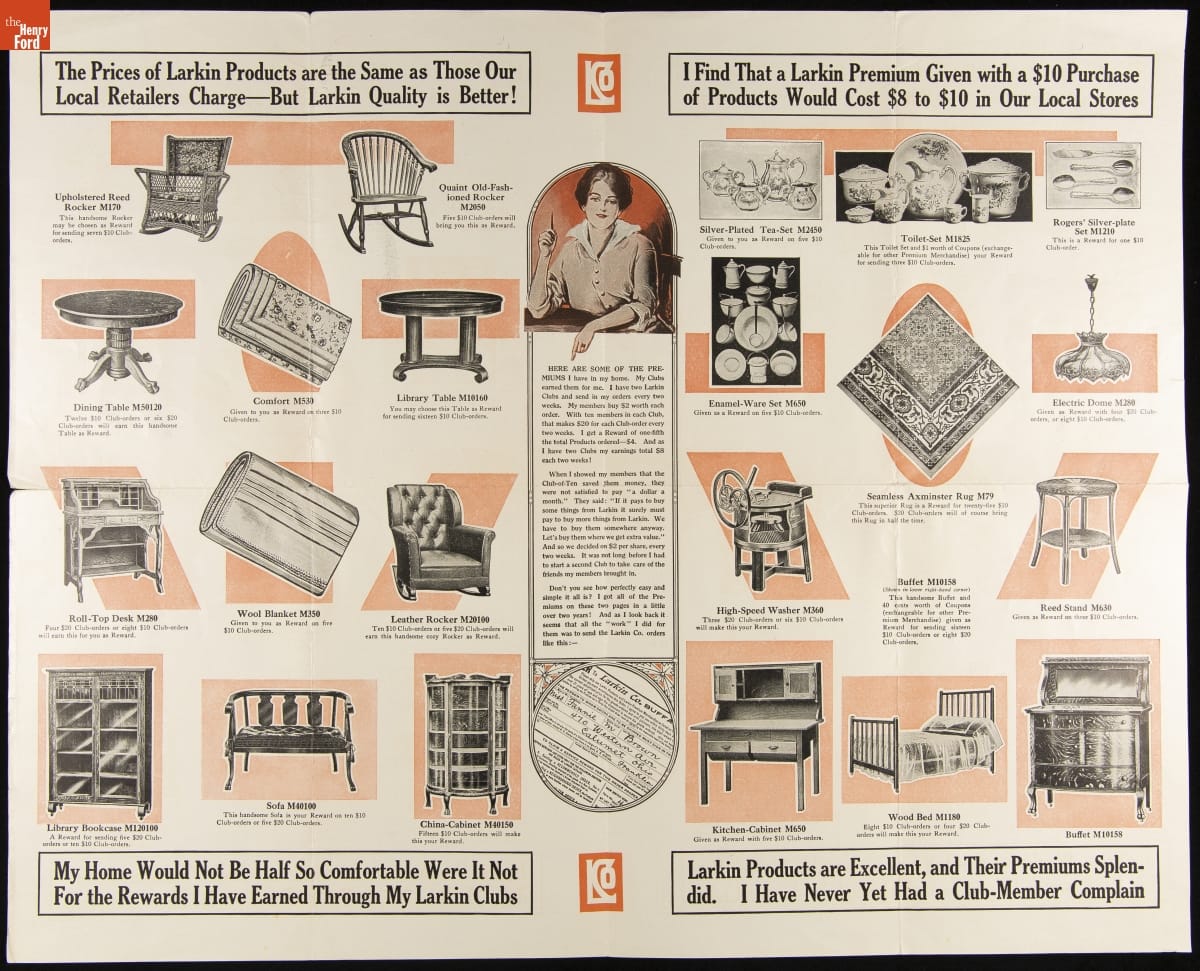 John D. Larkin established a soap manufacturing company in 1875. He hired his brother-in-law, Elbert Hubbard, as a salesman. Hubbard developed "The Larkin Idea," a plan that sold goods directly to consumers through mail-order catalogs and offered incentivizing giveaways. It was a success. By the early 1900s, Larkin's catalogs contained pages of products and even more pages of premiums from which customers could choose.