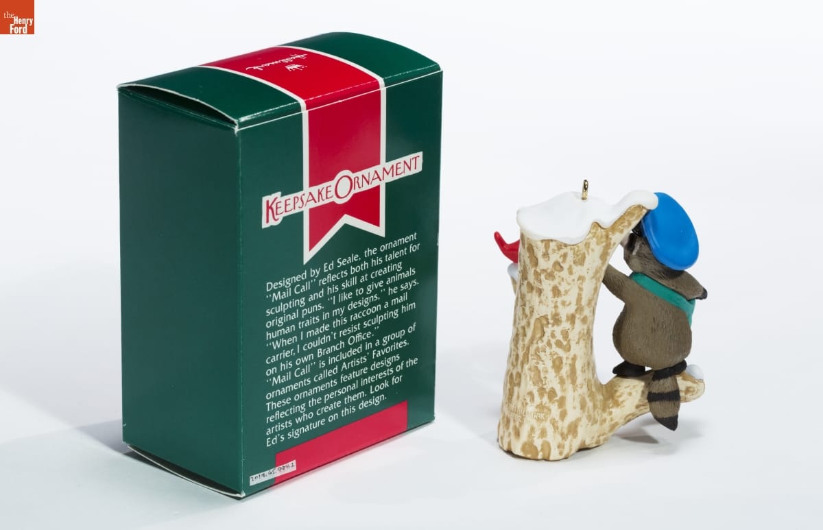 KEEPSAKE ORNAMENT / Designed by Ed Seale,the ornament / "Mail Call" reflects both his talent for / sculpting and his skill at creating / original puns. "I like to give animals / human traits in my designs," he says. / "When I made this raccoon a mail / carrier, I couldn't resist sculpting him / on his own Branch Office." / "Mail Call" is included in a group of / ornaments called Artists' Favorites. / These ornaments feature designs / reflecting the personal interests of the / artists who create them. Look for / Ed's signature on this design.