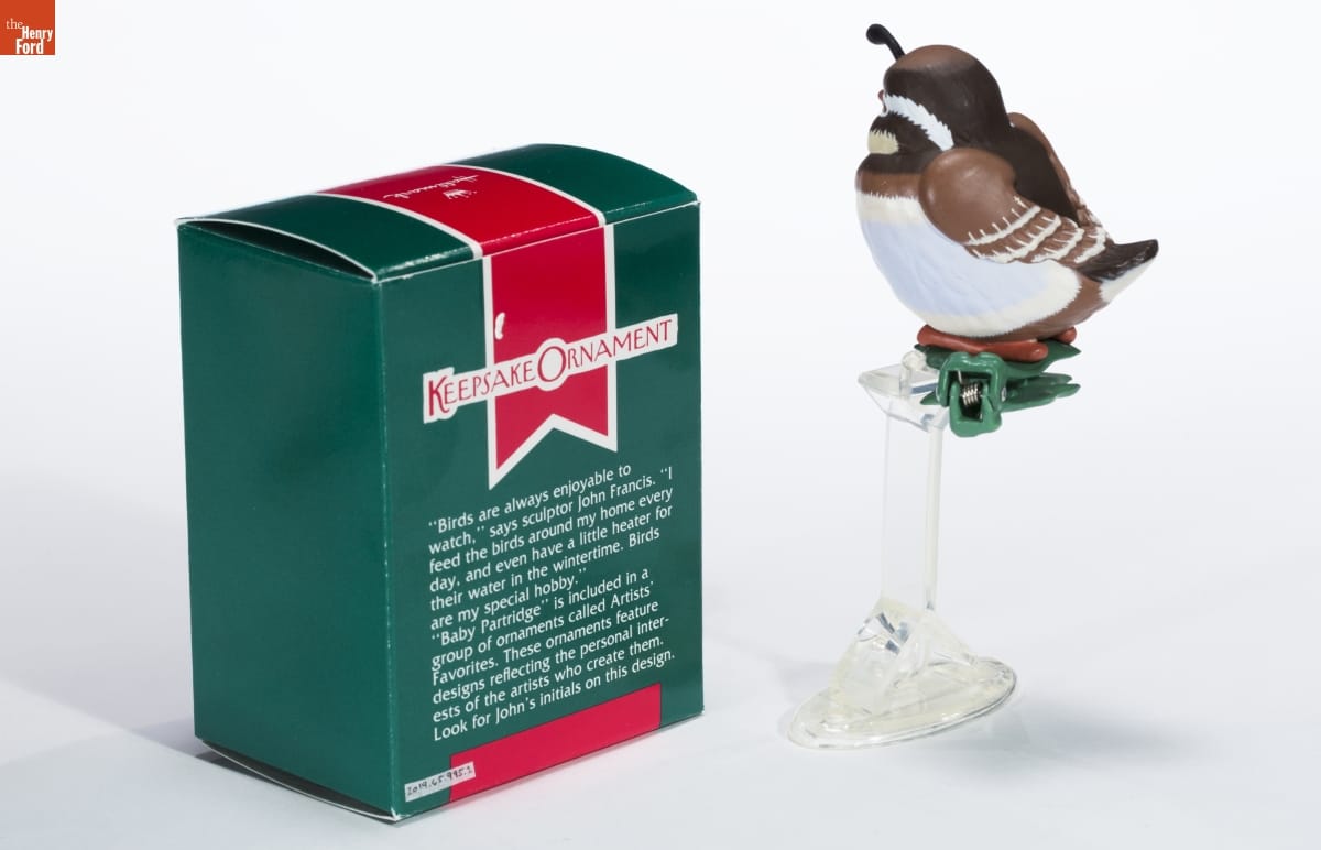 KEEPSAKE ORNAMENT / "Birds are always enjoyable to / watch," says sculptor John Francis. "I / feed the birds around my home every / day, and even have a little heater for / their water in the wintertime. Birds / are my special hobby." / "Baby Partridge" is included in a / group of ornaments called Artists' / Favorites. These ornaments feature / designs reflecting the personal inter- / ests of the artists who create them. / Look for John's initials on this design.
