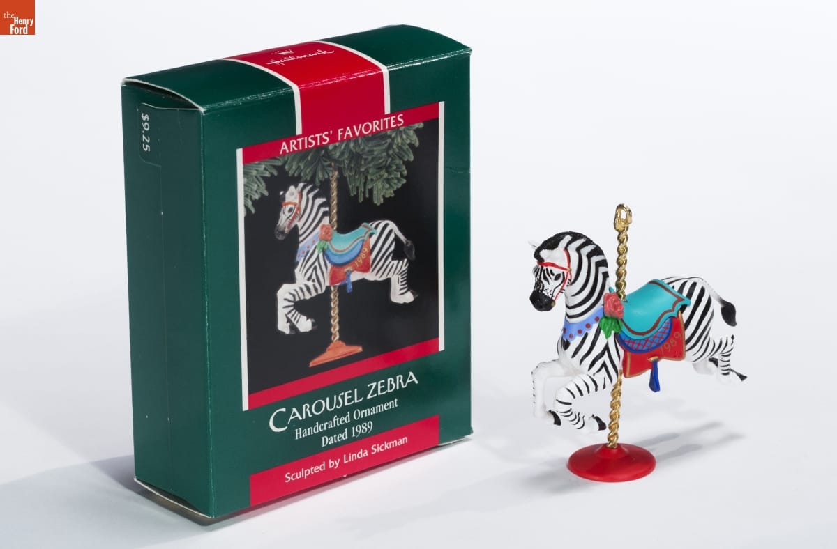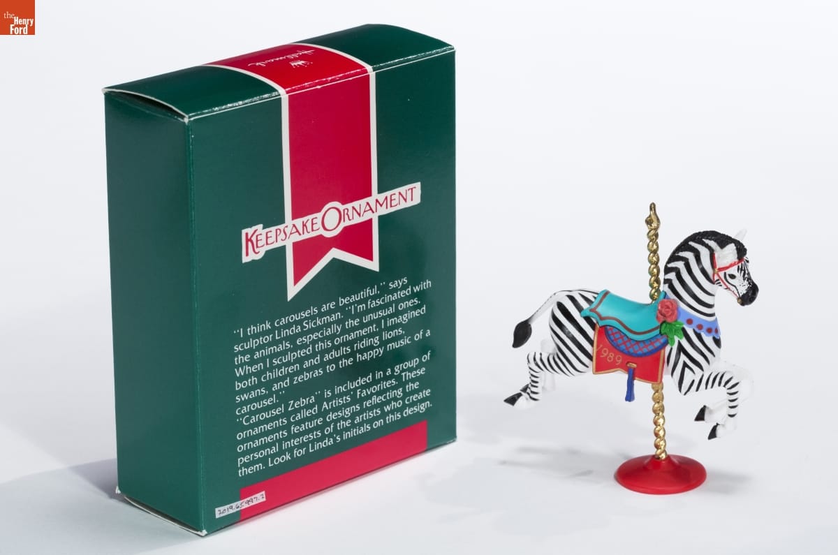 KEEPSAKE ORNAMENT / "I think carousels are beautiful," says / sculptor Linda Sickman. "I'm fascinated with / the animals, especially the unusual ones. / When I sculpted this ornament, I imagined / both children and adults riding lions, / swans, and zebras to the happy music of a / carousel." / "Carousel Zebra" is included in a group of / ornaments called Artists' Favorites. These / ornaments feature designs reflecting the / personal interests of the artists who create / them. Look for Linda's initials on this design.