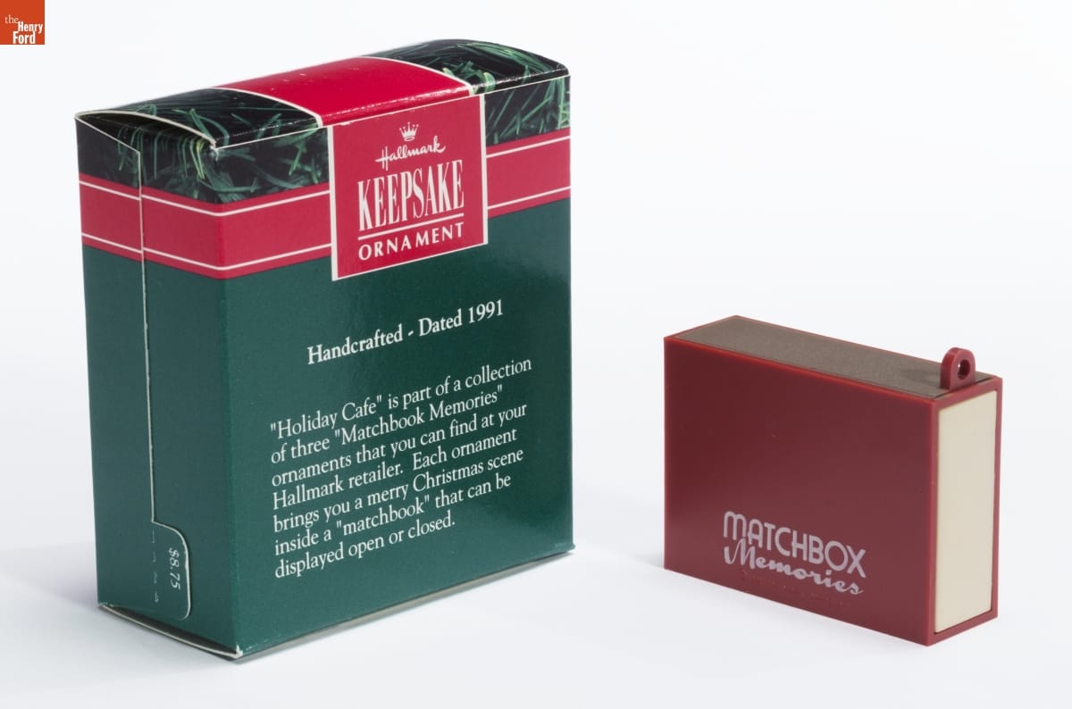Hallmark / KEEPSAKE / ORNAMENT / Handcrafted - Dated 1991 / "Holiday Cafe" is part of a collection / of three "Matchbook Memories" / ornaments that you can find at your / Hallmark retailer. Each ornament / brings you a merry Christmas scene / inside a "matchbook" that can be / displayed open or closed.