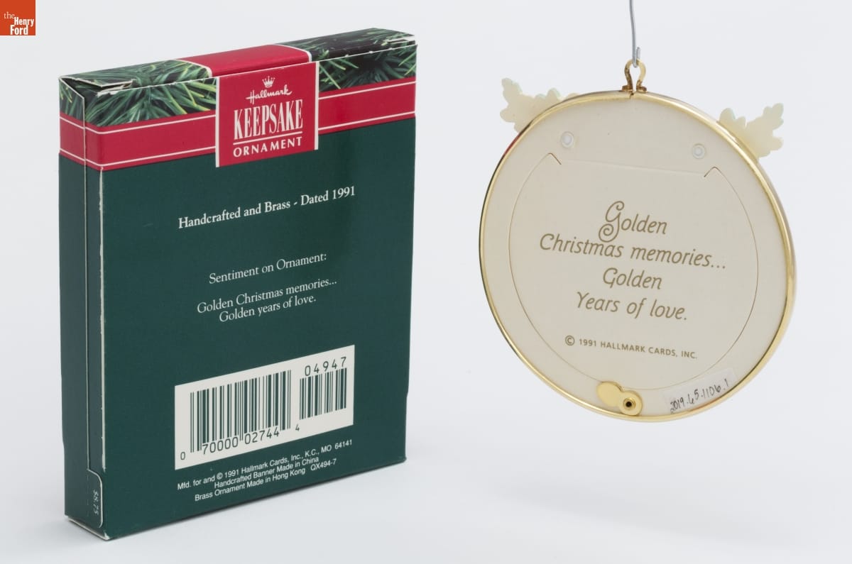Handcrafted and Brass - Dated 1991 / Sentiment on Ornament: / Golden Christmas memories... / Golden years of love. / Mfd. for and (C) 1991 Hallmark Cards, Inc., K.C., MO 64141 / Handcrafted Banner Made in China / Brass Ornament Made in Hong Kong QX494-7