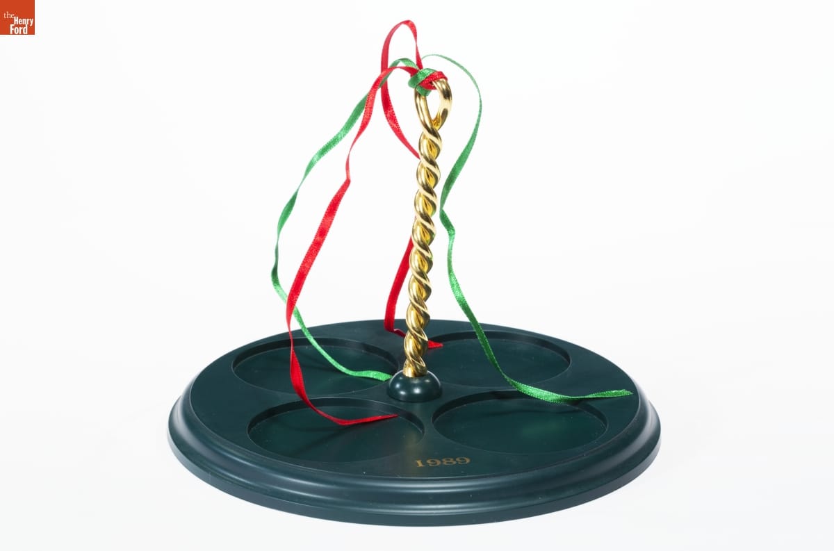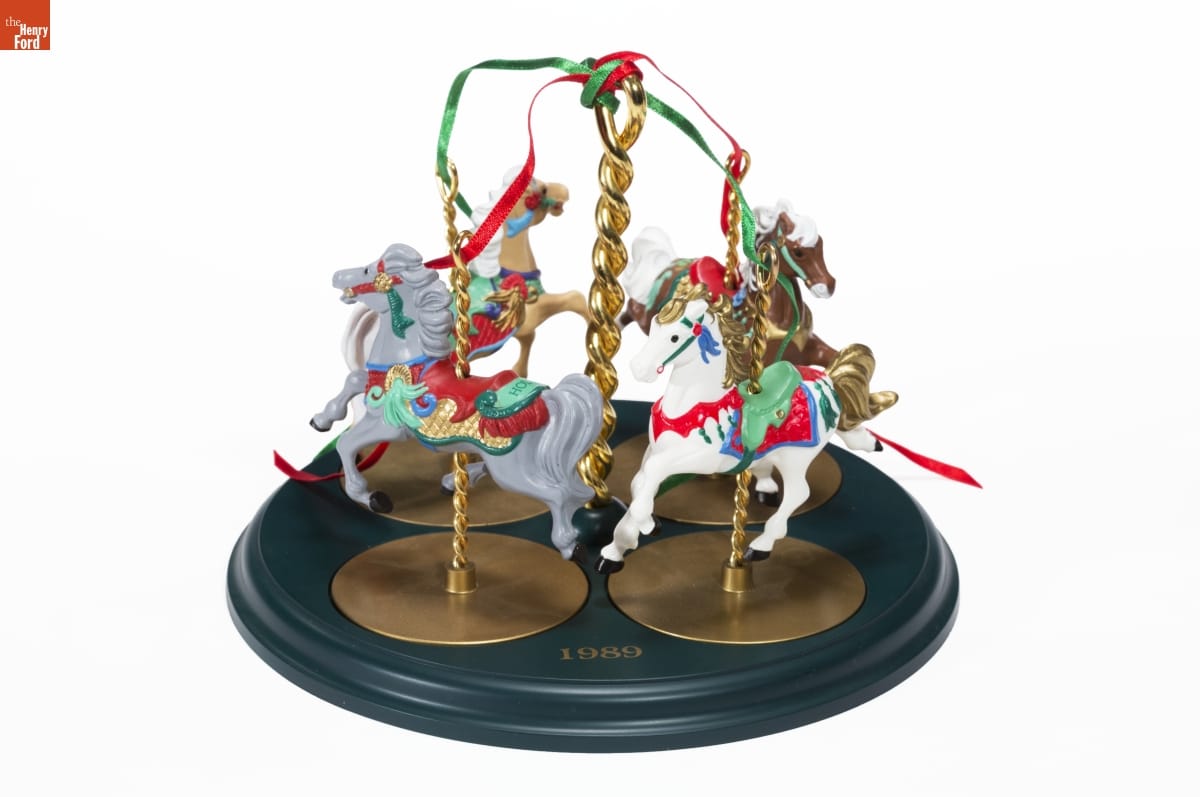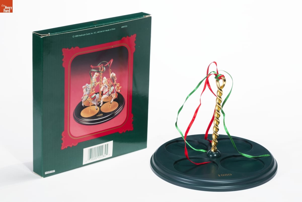Already known for greeting cards, Hallmark introduced a line of Christmas ornaments in 1973. The company's annual release of an increasing array of ornaments revolutionized Christmas decorating. In 1989, Hallmark released a group of four collectible ornaments depicting carousel horses. They could be hung individually on a Christmas tree or displayed together on this specially designed stand.