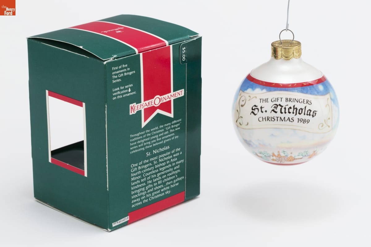 First of five / ornaments in / The Gift Bringers / Series. / Look for series / verification 1 / on this ornament. / KEEPSAKE ORNAMENT / Throughout the world, the many different / traditions of the Christmas "Gift Bringer" / have delighted young and old. This new / series will bring you five ornaments / celebrating these beloved givers of joy. / St. Nicholas / One of the most popular of the / Gift Bringers, St. Nicholas was a / fourth-century bishop in Asia / Minor. Countless legends in many / lands tell of his generosity and / kindness. He lands on rooftops, / bringing gifts to fill children's / stockings and shoes...then gallops / away on his great white horse / across the Christmas sky.