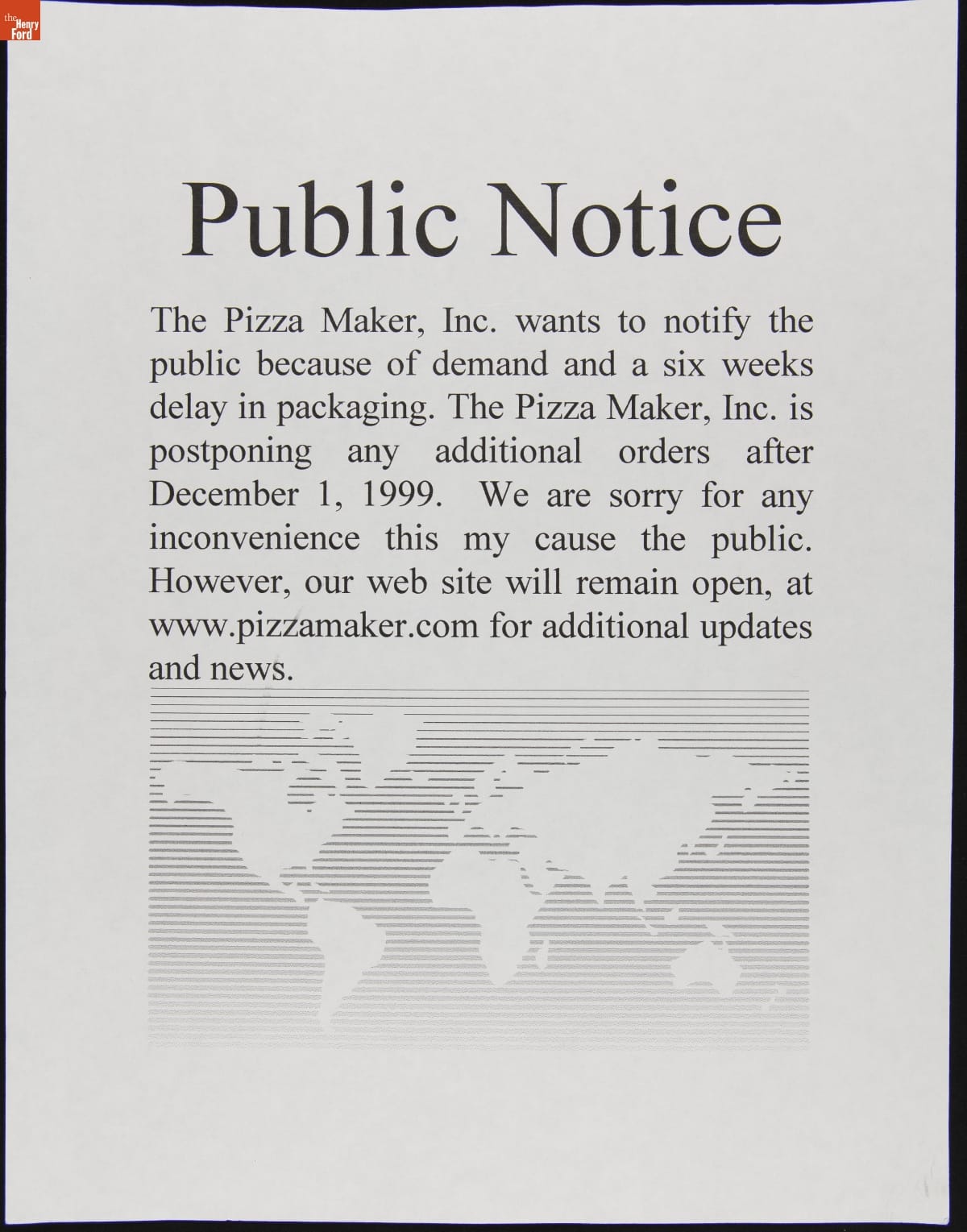 Public Notice of a Delay in Food Orders for The Pizza Maker after December 1, 1999