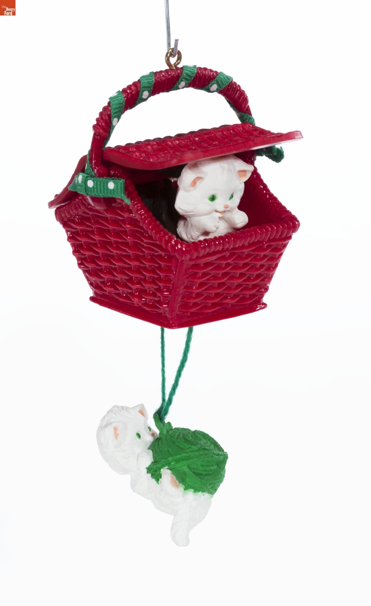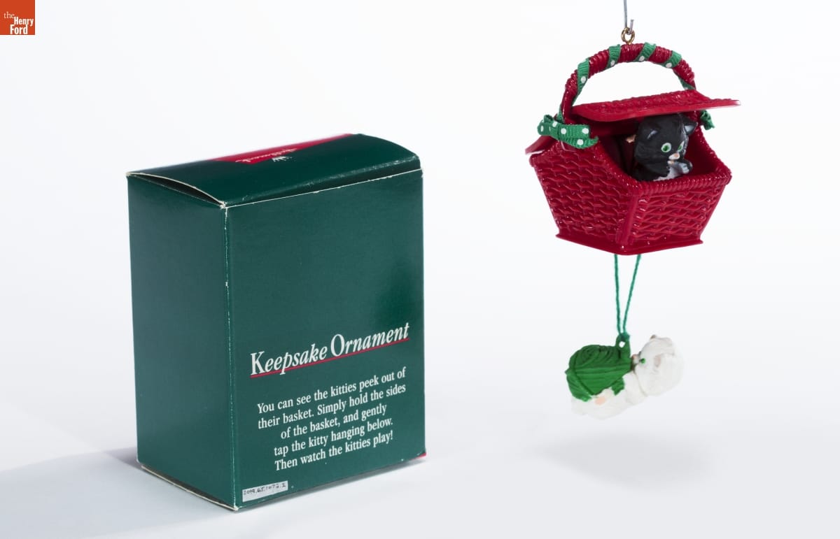 Keepsake Ornament / You can see the kitties peek out of / their basket. Simply hold the sides / of the basket, and gently / tap the kitty hanging below. / Then watch the kitties play!