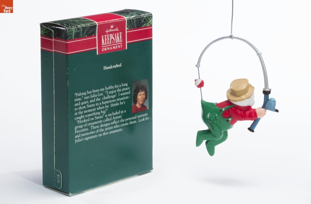 Hallmark / KEEPSAKE / ORNAMENT / Handcrafted / "Fishing has been my hobby for a long / time," says Julia Lee. "I enjoy the peace / and quiet, and the challenge! I wanted / to show Santa in a humorous situation - / at the moment when he thinks he's / caught something big!" / "Hooked on Santa" is included in a / group of ornaments called Artists' / Favorites. These designs reflect the personal interests / and memories of the artists who create them. Look for / Julia's signature on this ornament.