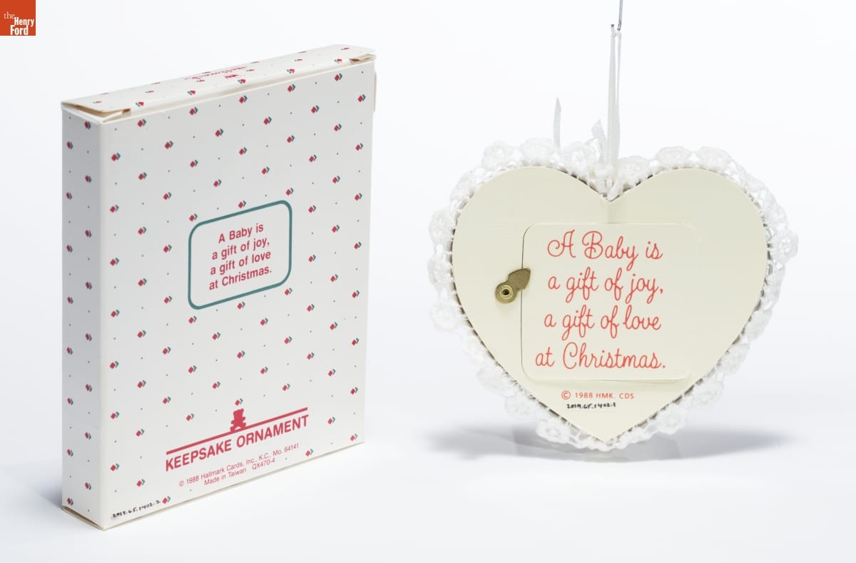 A Baby is / a gift of joy, / a gift of love / at Christmas / KEEPSAKE ORNAMENT / (c) 1988 Hallmark Cards, Inc., K.C., Mo. 64141 / Made in Taiwan QX470-4