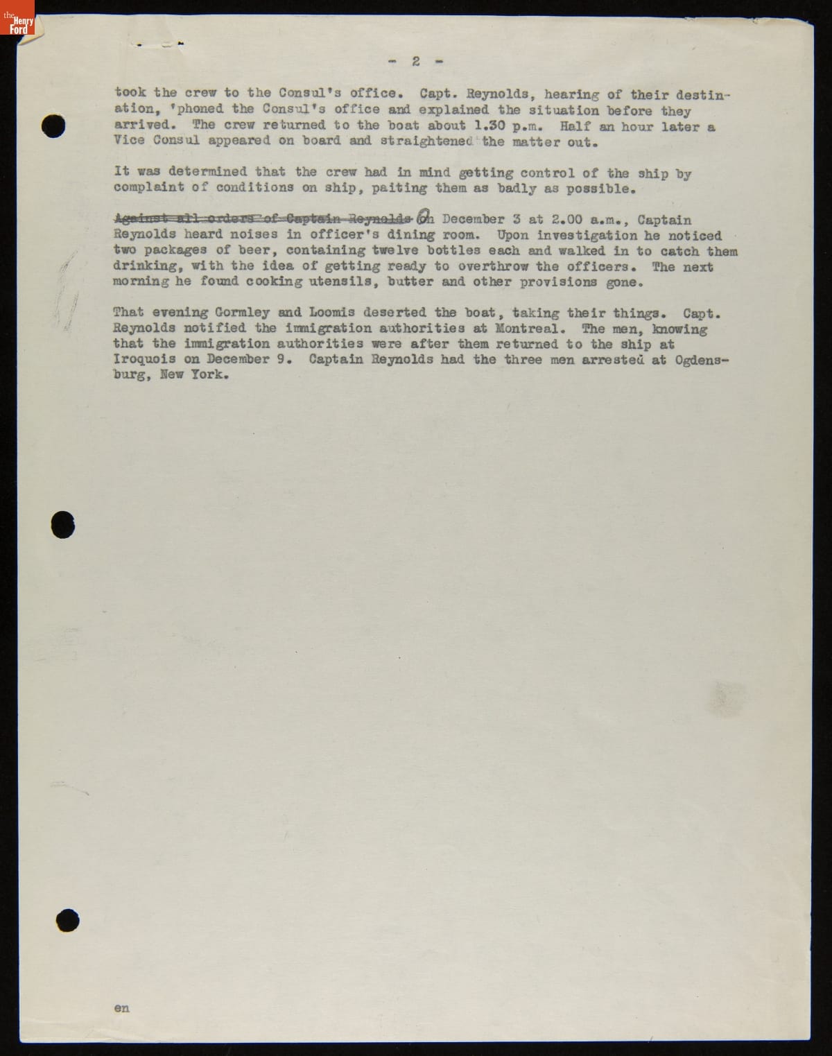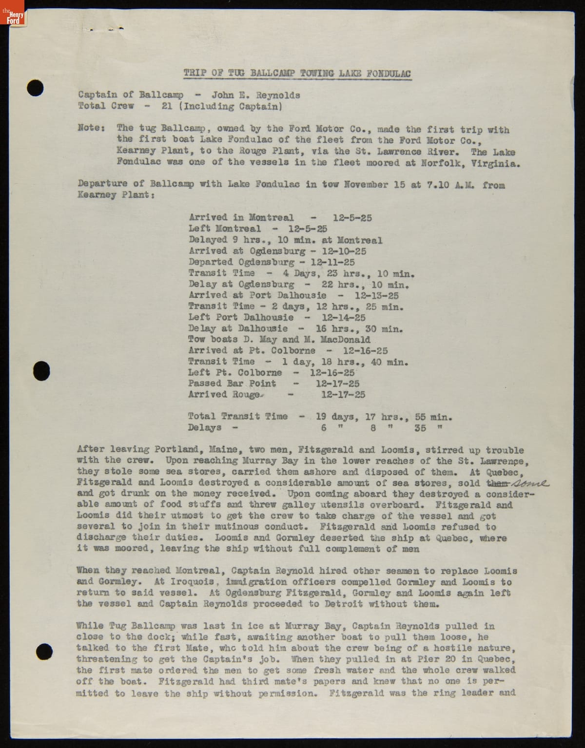 Henry Ford purchased 199 surplus World War I merchant ships from the United States government in 1925. Many of these ships were towed to Ford's River Rouge Plant to be scrapped. The Lake Fondulac was one of the first towed to the scrapyard. This report documents the labor troubles the captain of the tugboat Ballcamp encountered during the voyage.