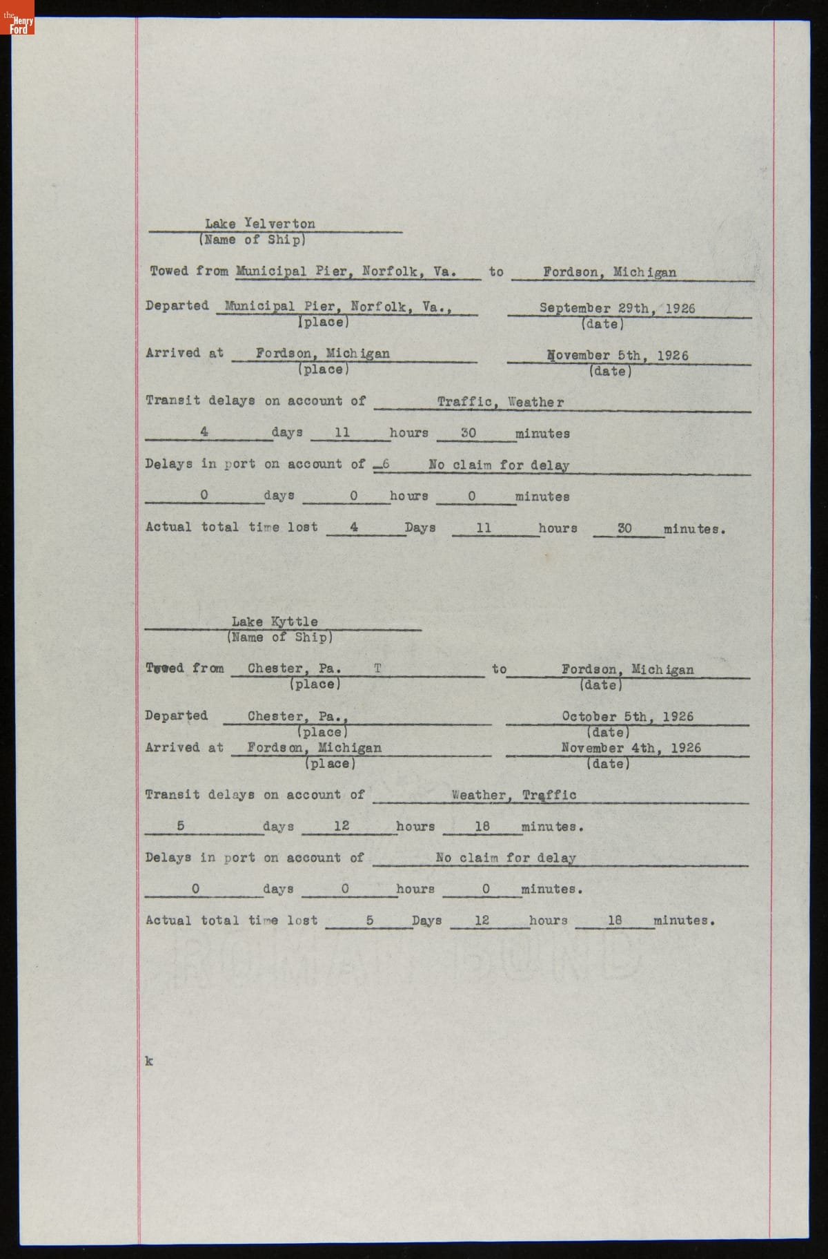 Ship Delay Report for Ford Barge "Lake Kyttle," circa 1926