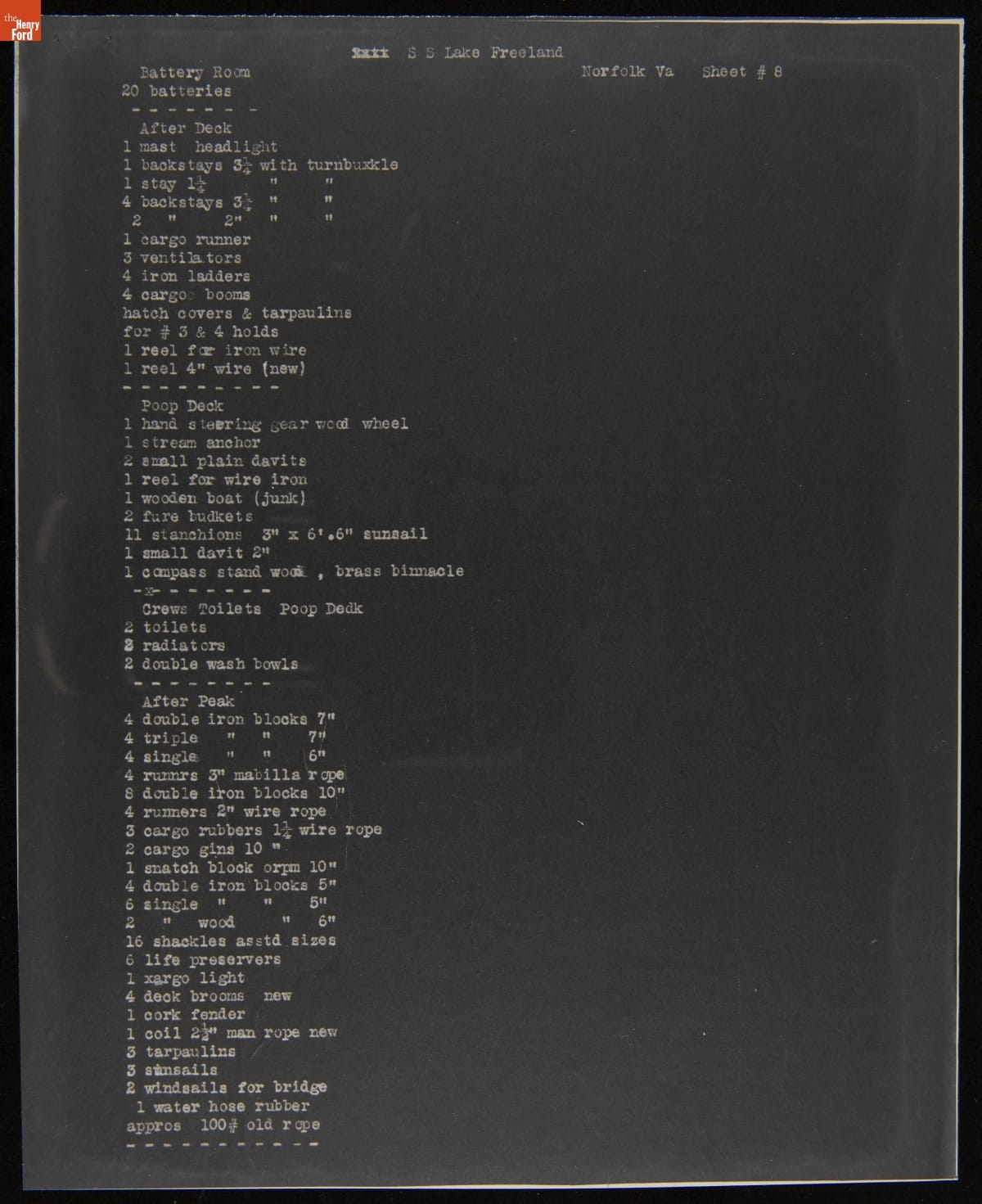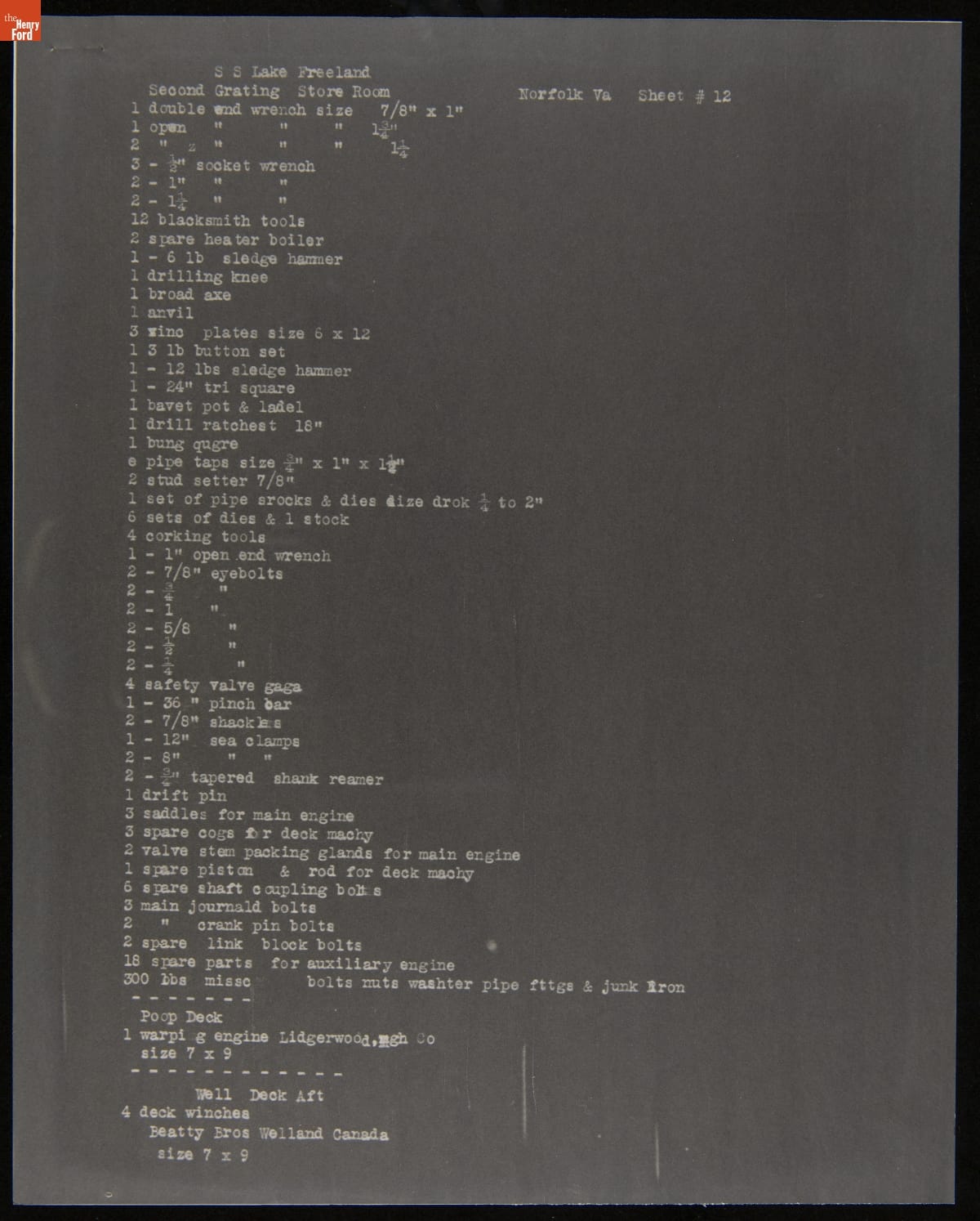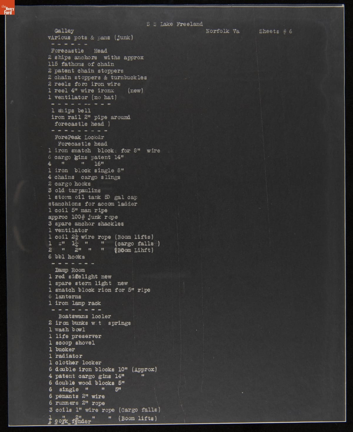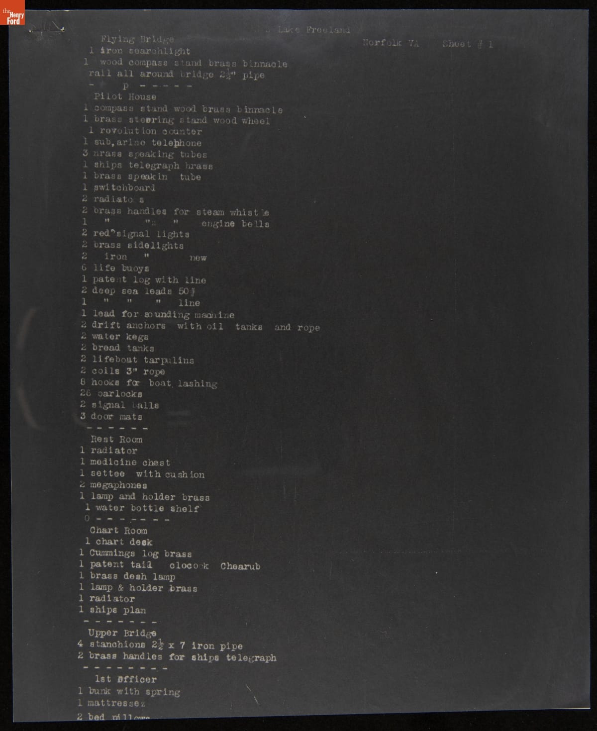 Inventory of Ford Barge "Lake Freeland," circa 1925-1926