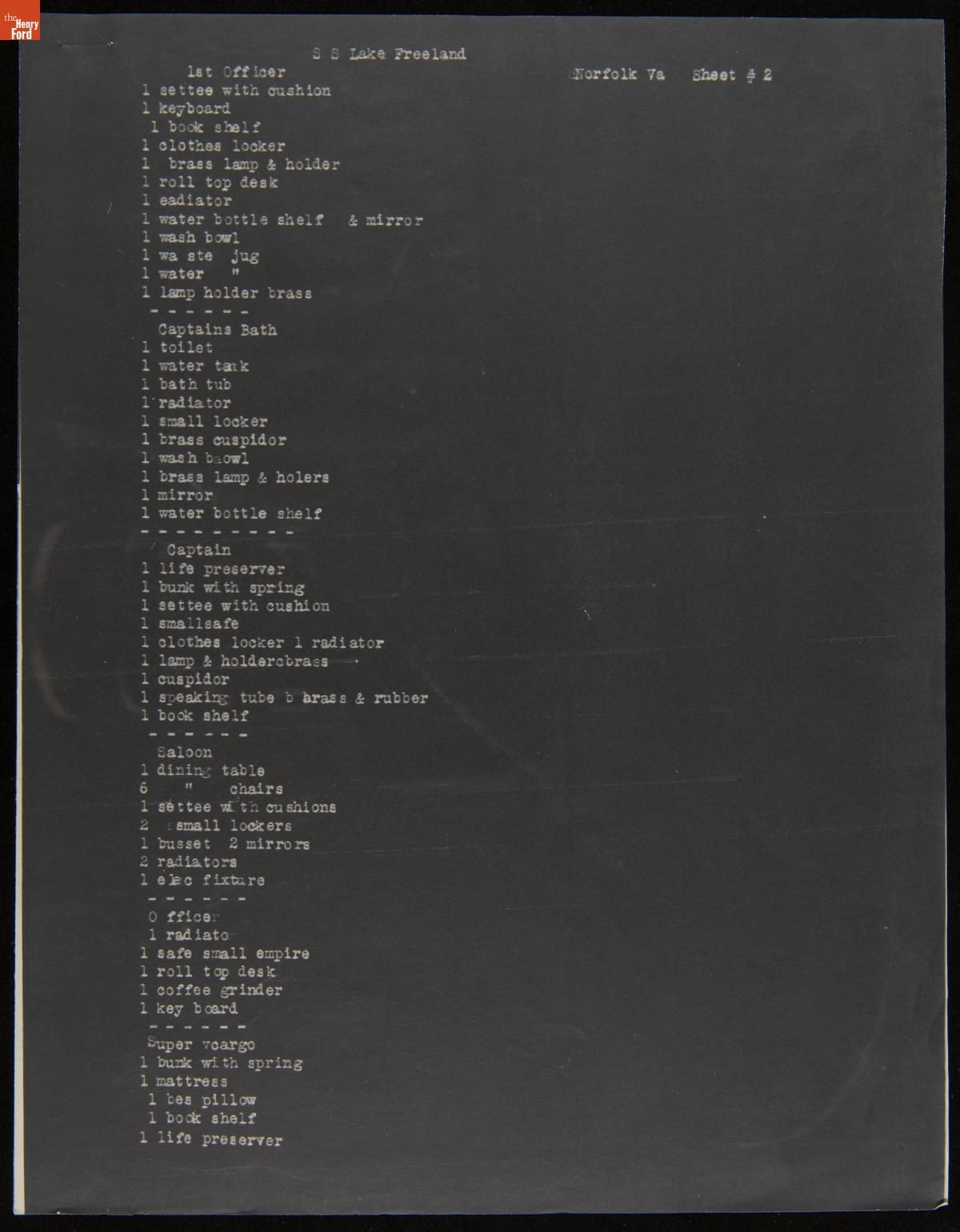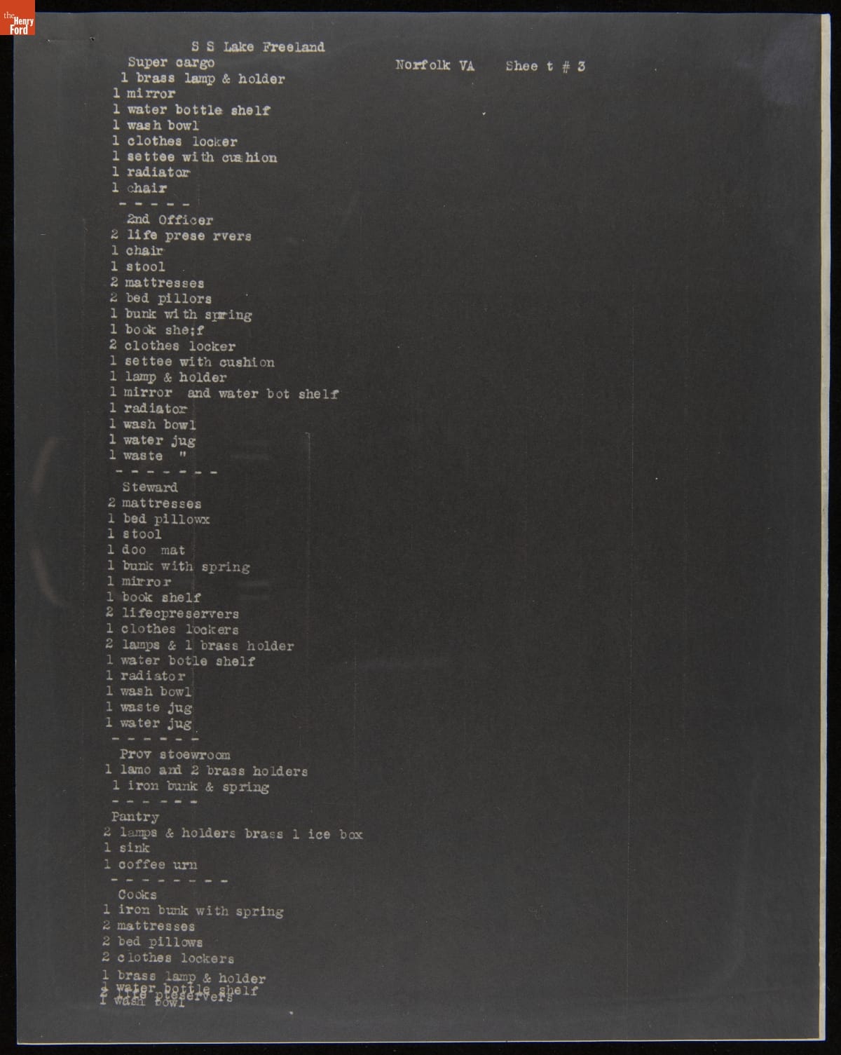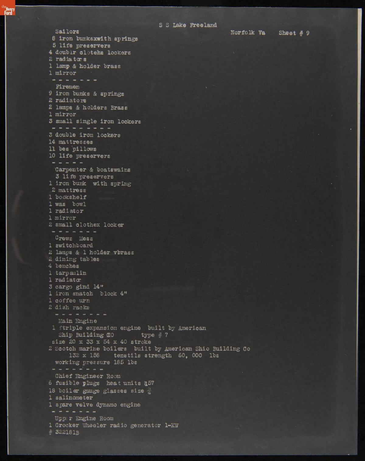 Inventory of Ford Barge "Lake Freeland," circa 1925-1926
