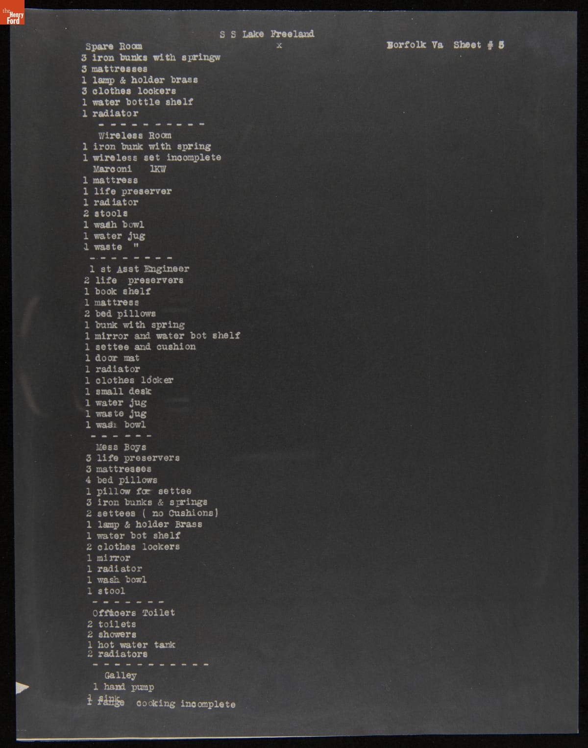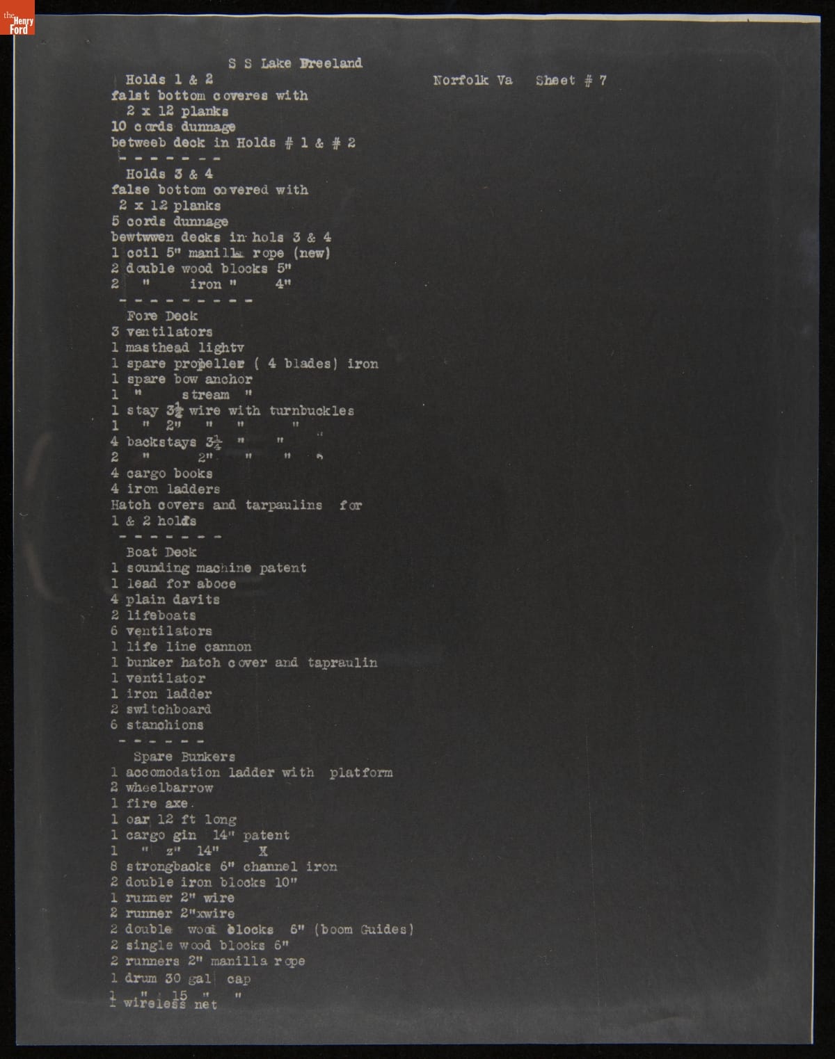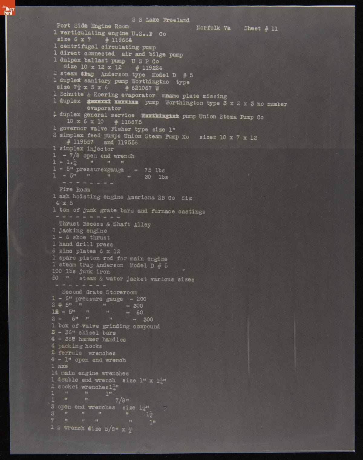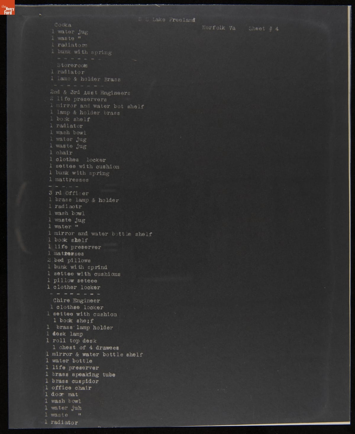 Inventory of Ford Barge "Lake Freeland," circa 1925-1926