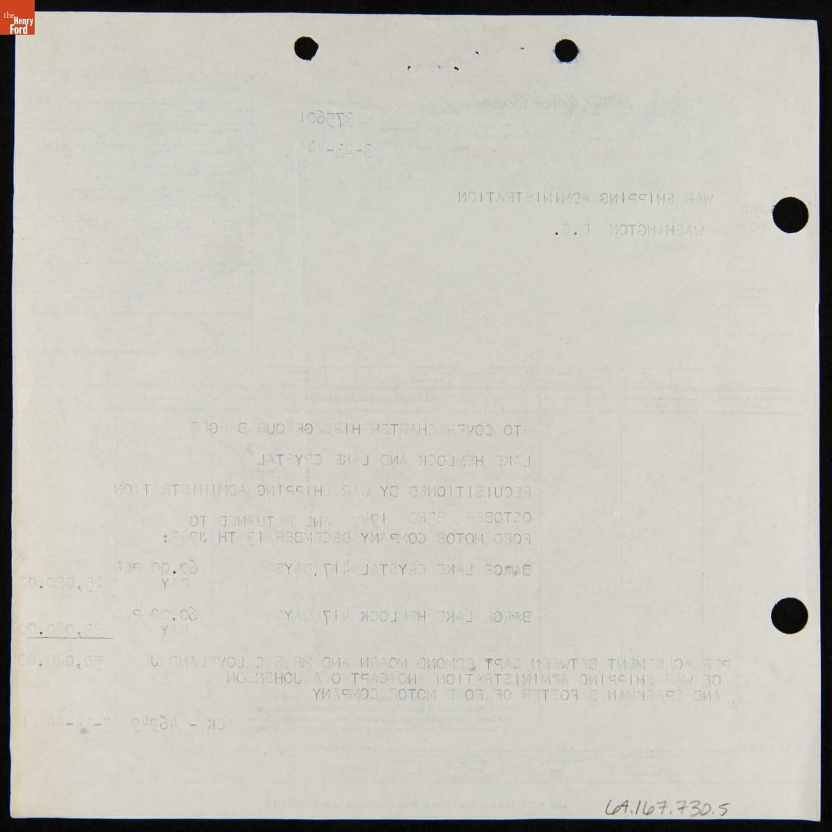 Invoice to War Shipping Administration for Use of Ford Barges "Lake Hemlock" and "Lake Crystal," March 24, 1944