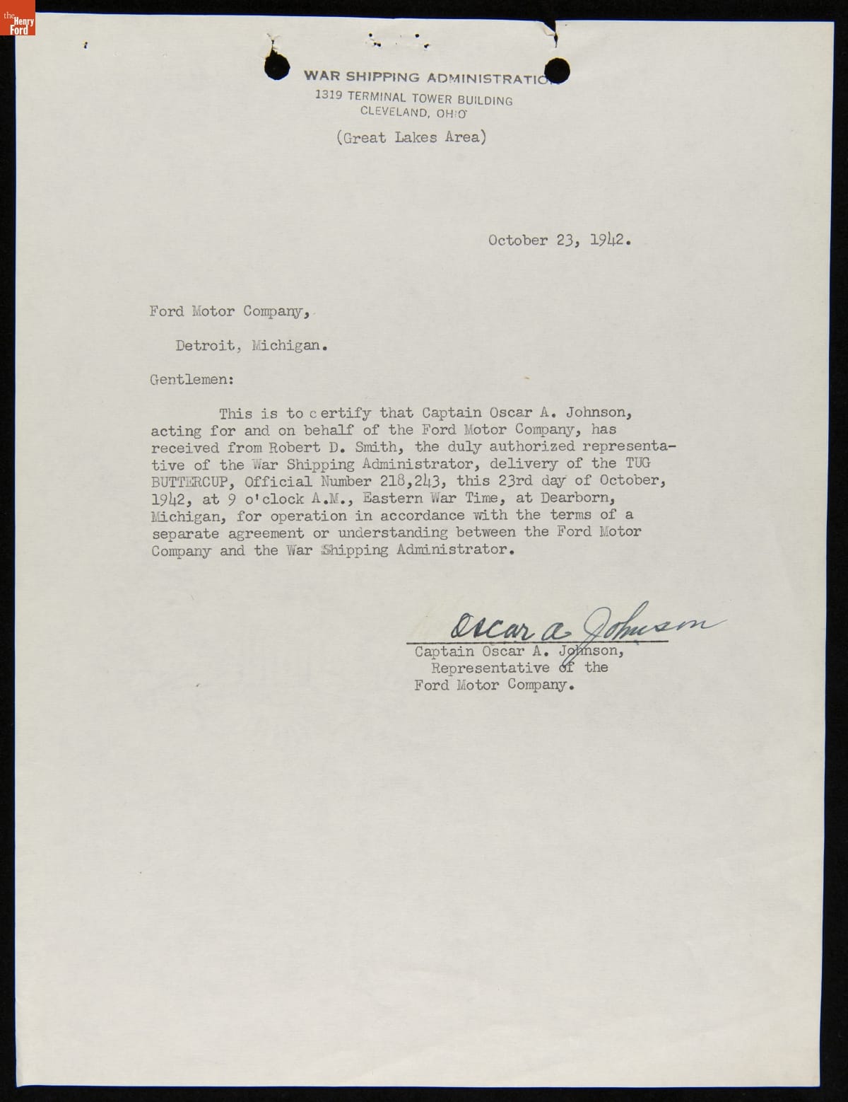 Letter Certifying Receipt of Ford Tugboat "Buttercup" for War Service, October 23, 1942