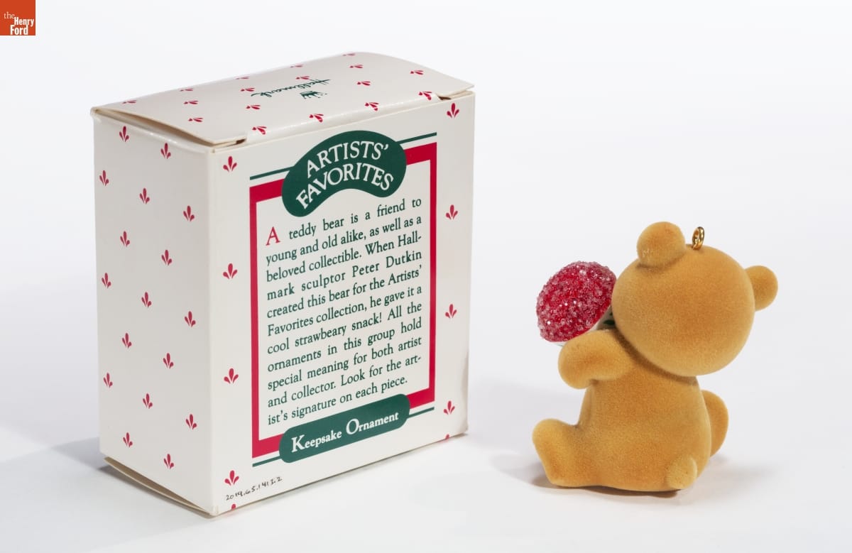 ARTISTS' / FAVORITES / A teddy bear is a friend to / young and old alike, as well as a / beloved collectible. When Hall- / mark sculptor Peter Dutkin / created this bear for the Artists' Favorites collection, he gave it a / cool strawbeary snack! All the / ornaments in this group hold / special meaning for both artist / and collector. Look for the art- / ist's signature on each piece. / Keepsake Ornament
