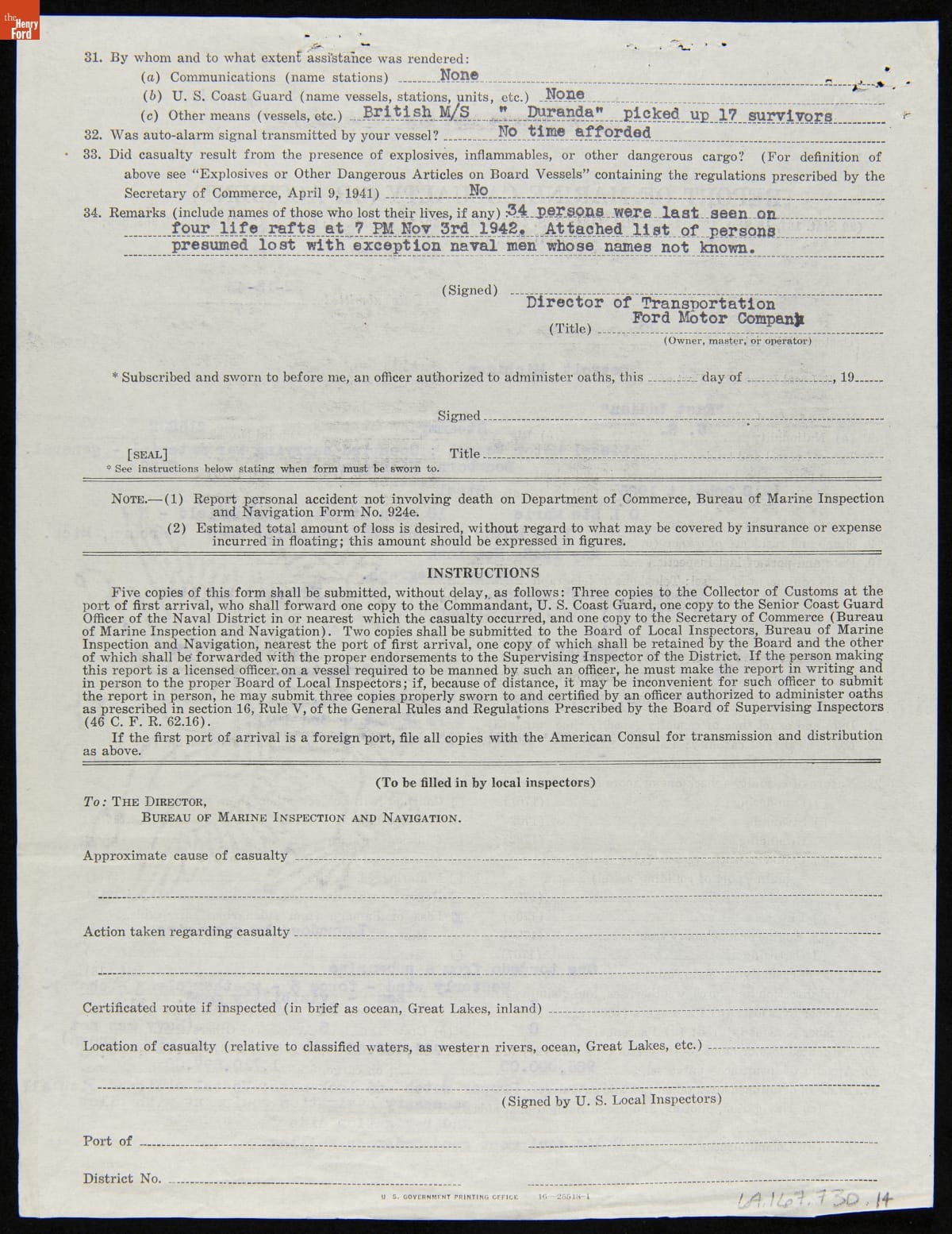 Report of Marine Casualty or Accident for Sunken Ford Freighter "East Indian," February 15, 1943