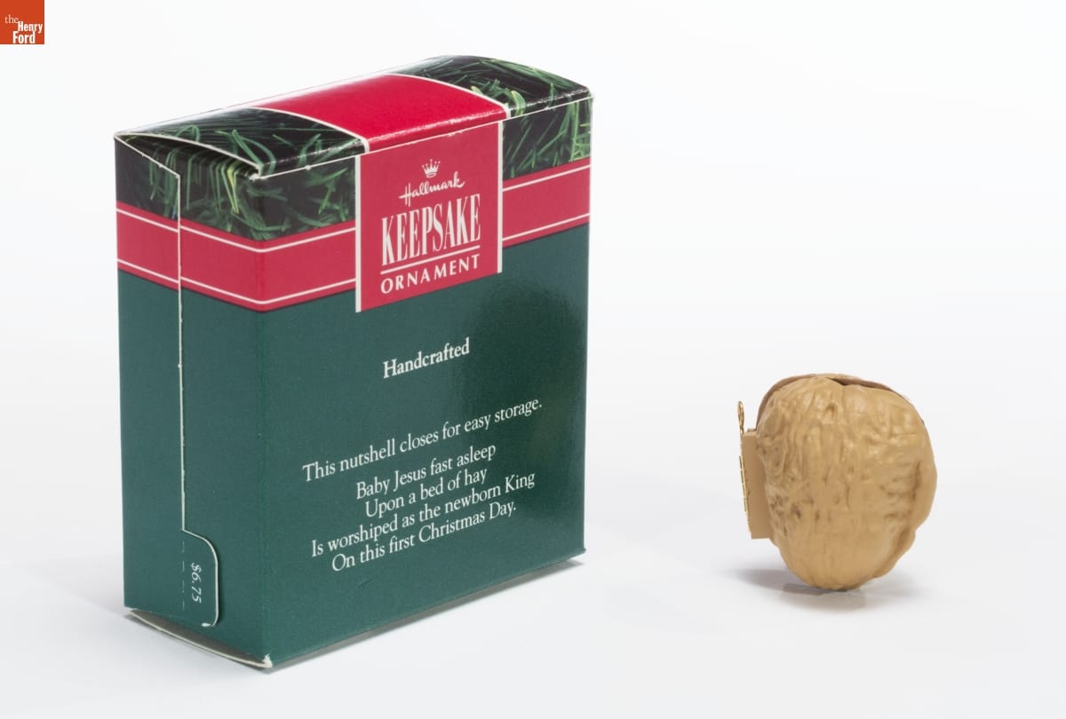 Hallmark / KEEPSAKE / ORNAMENT / Handcrafted / This nutshell closes for easy storage. / Baby Jesus fast asleep / Upon a bed of hay / Is worshipped as the newborn King / On this first Christmas Day.