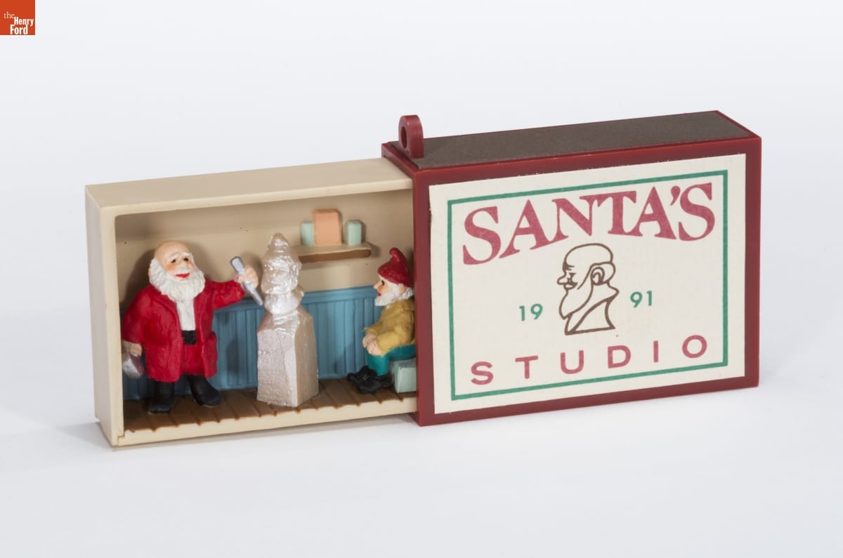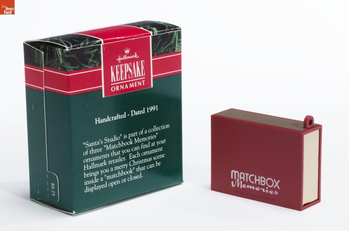 Hallmark / KEEPSAKE / ORNAMENT / Handcrafted - Dated 1991 / "Santa's Studio" is part of a collection / of three "Matchbook Memories" / ornaments that you can find at your / Hallmark retailer. Each ornament / brings you a Merry Christmas scene / inside a "matchbook" that can be / displayed open or closed.