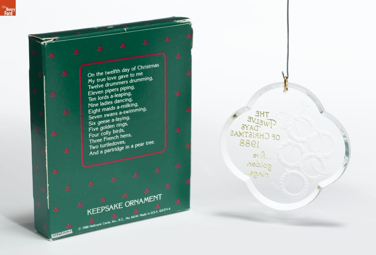 On the twelfth day of Christmas / My true love gave to me / Twelve drummers drumming, / Eleven pipers piping, / Ten lords a-leaping, / Nine ladies dancing, / Eight maids a-milking, / Seven swans a-swimming, / Six geese a-laying, / Five golden rings, / Four colly birds, / Three French hens, / Two turtledoves, / And a partridge in a pear tree. / KEEPSAKE ORNAMENT / (c) 1988 Hallmark Cards, Inc., K.C., Mo. 64141 Made in U.S.A. QX371-4