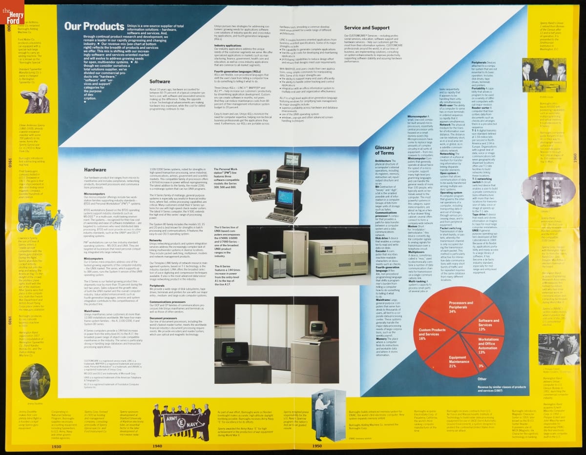 In 1986, the Burroughs and Sperry corporations merged to create Unisys. It was one of the largest mergers in the computer and information technology industry. Both companies had a long lineage of developing cutting-edge computing technology. Burroughs started in the late 1800s producing calculating machines, and Sperry formed in the early 1900s making navigation equipment and later built UNIVAC computers.