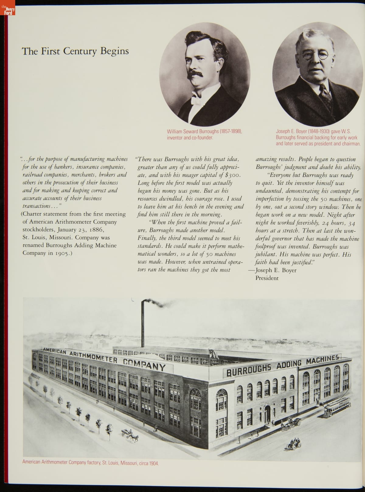 William Seward Burroughs and three other co-founders established the American Arithmometer Company in 1886 to produce simple addition and subtraction machines. Over the years, the company--later known as the Burroughs Corporation--innovated and expanded. Mergers with companies such as Moon-Hopkins and Sperry in the 20th century helped Burroughs become a leader in the calculating--and later computing--industry.