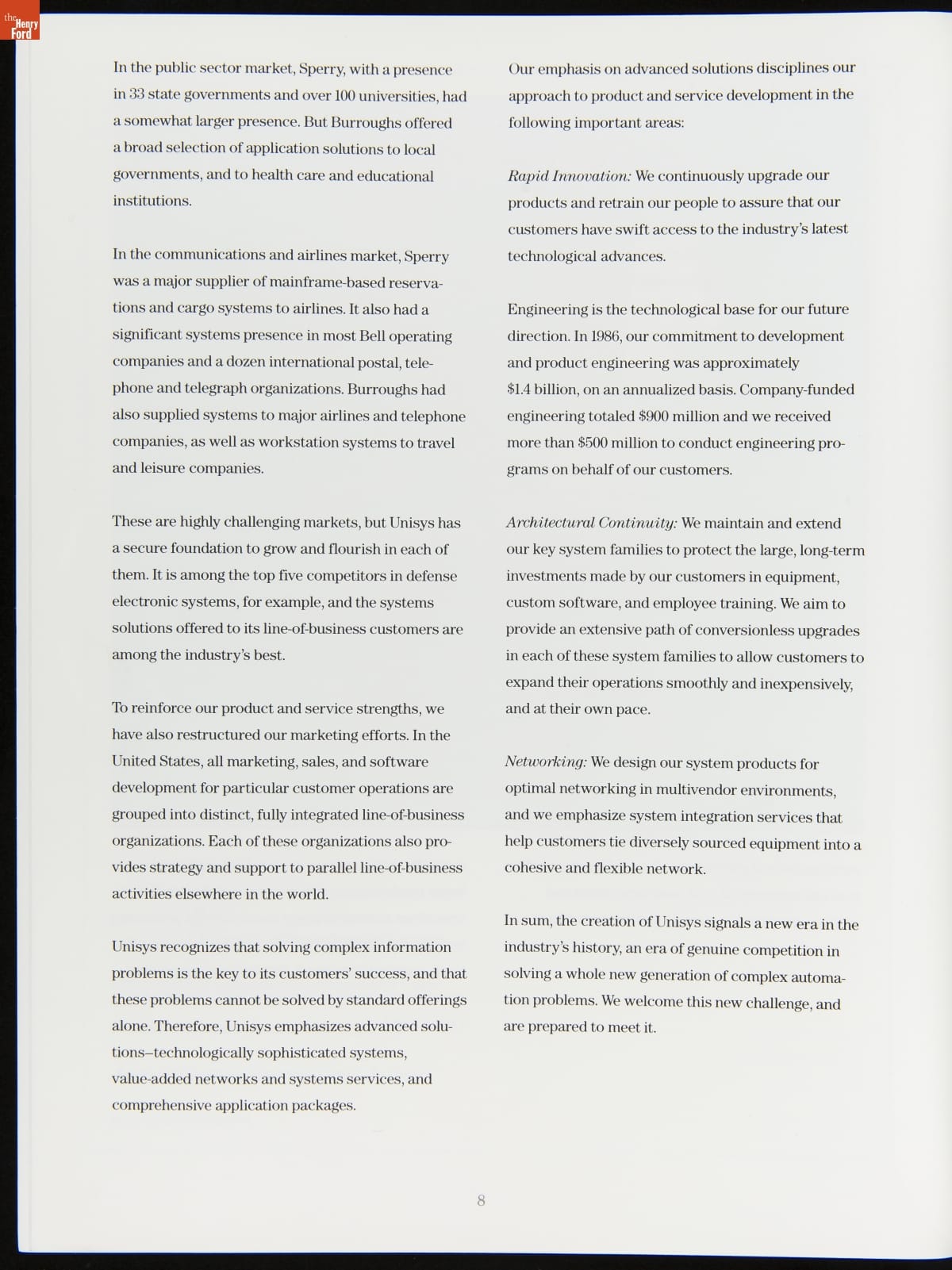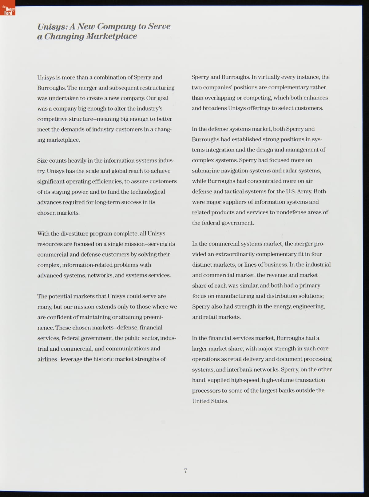 In 1986, the Burroughs and Sperry corporations merged to create Unisys. It was one of the largest mergers in the computer and information technology industry. Both companies had a long lineage of developing cutting-edge computing technology. Burroughs started in the late 1800s producing calculating machines, and Sperry formed in the early 1900s making navigation equipment and later built UNIVAC computers.