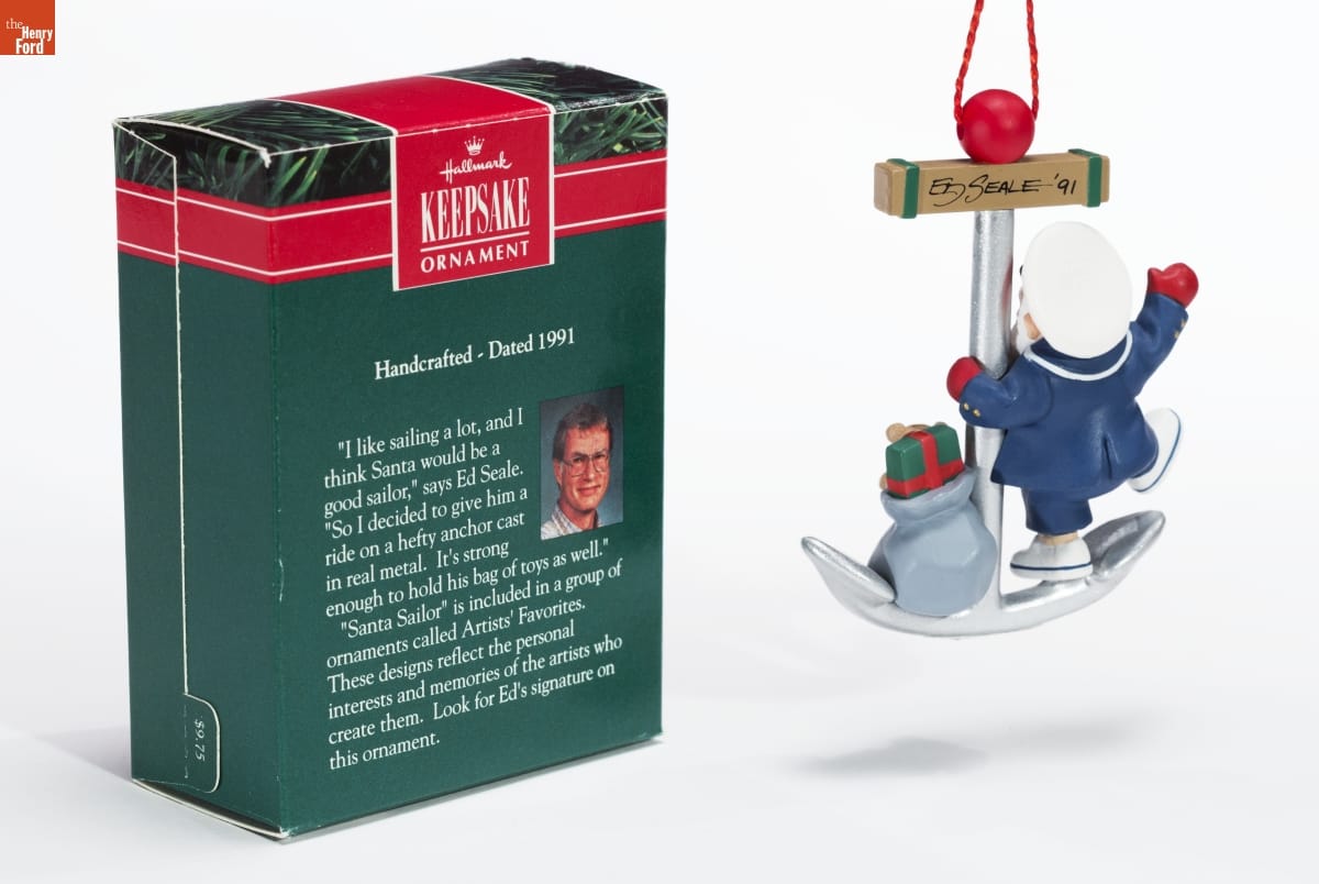 Hallmark / KEEPSAKE / ORNAMENT / Handcrafted - Dated 1991 / "I like sailing a lot, and I / think Santa would be a / good sailor," says Ed Seale. / "So I decided to give him a / ride on a hefty anchor cast / in real metal. It's strong / enough to hold his bag of toys as well." / "Santa Sailor" is included in a group of / ornaments called Artists' Favorites. / These designs reflect the personal / interests and memories of the artists who / create them. Look for Ed's signature on / this ornament.
