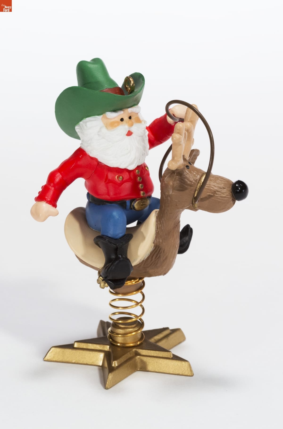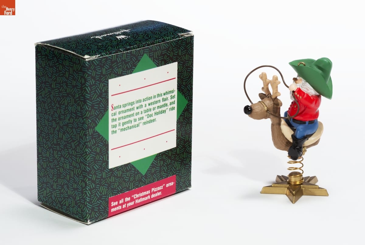 Santa springs into action in this whimisi- / cal ornament with a western flair. Set / the ornament on a table or mantle, and / tap it gently to see "Doc Holiday" ride / the "mechanical" reindeer. / See all the "Christmas Pizzazz" orna- / ments at your Hallmark dealer.