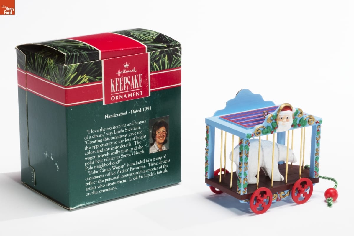 Hallmark / KEEPSAKE / ORNAMENT / Handcrafted - Dated 1991 / "I love the excitement and fantasy / of a circus," says Linda Sickman. / "Creating this ornament gave me / the opportunity to use lots of bright / colors and intricate details. The / wagon wheels really turn, and the / polar bear relates to Santa's North / Pole neighborhood!" / "Polar Circus Wagon" is included in a group of / ornaments called Artists' Favorites. These designs / reflects the personal interests and memories of the / artists who create them. Look for Linda's initials / on this ornament."