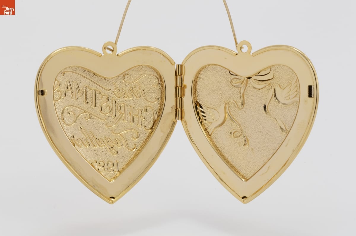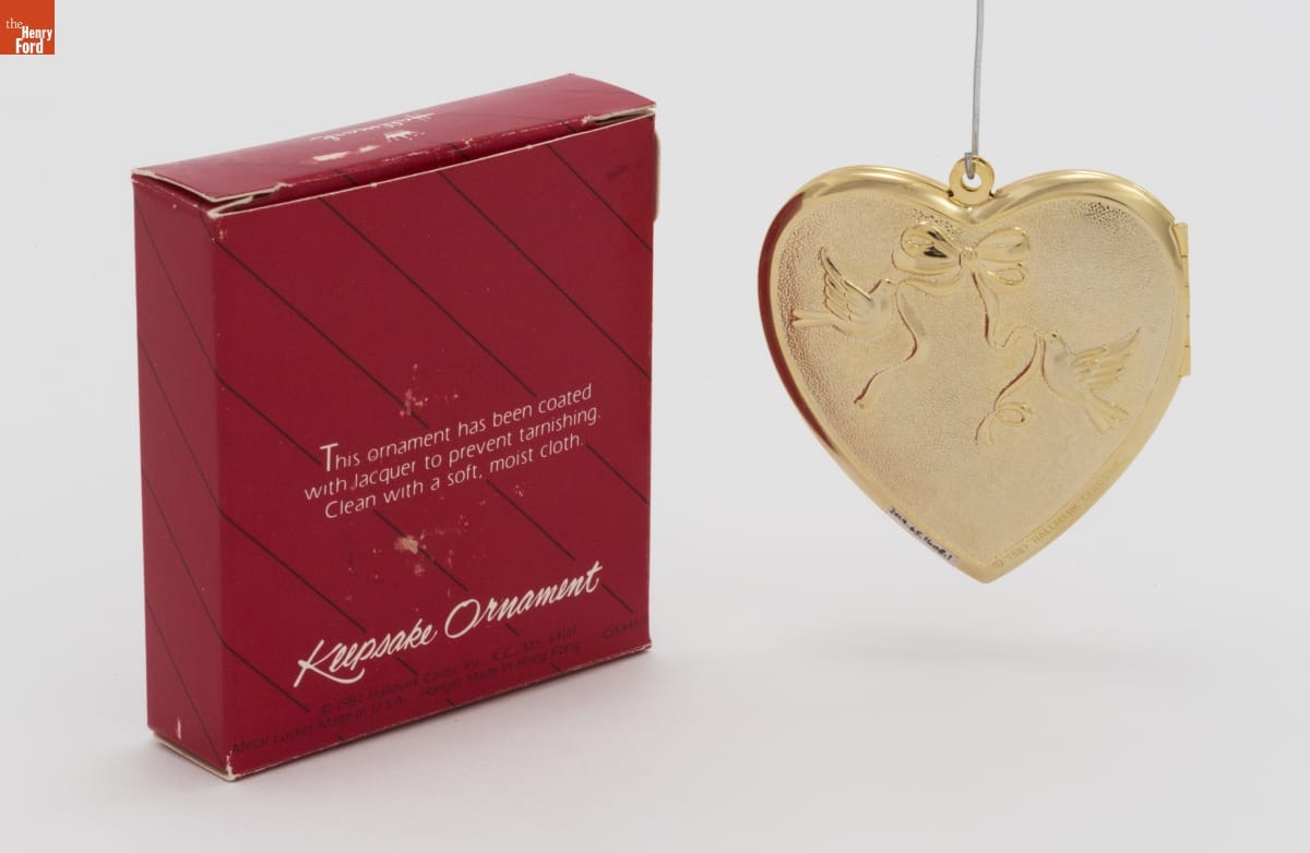 This ornament has been coated / with lacquer to prevent tarnishing. / Clean with a soft, moist cloth. / Keepsake Ornament / (c) 1987 Hallmark Cards, Inc., K.C., Mo. 64141 / Metal Locket Made in U.S.A. Hanger Made in Hong Kong QX446-9