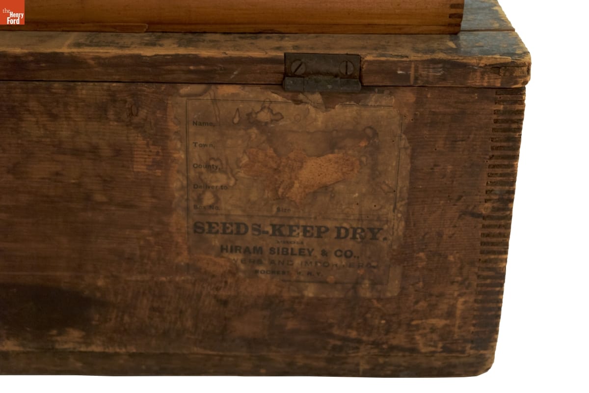 Hiram Sibley and Co., reputedly the largest seed grower in the world, owned land in several states and foreign countries, operated test gardens to improve seed quality, and used illustrations of multistory seed-packing warehouses to impress customers. Employees packed boxes like this one with collections of seeds (described in company catalogs) and shipped them to home gardeners, farmers, and general stores owners alike.