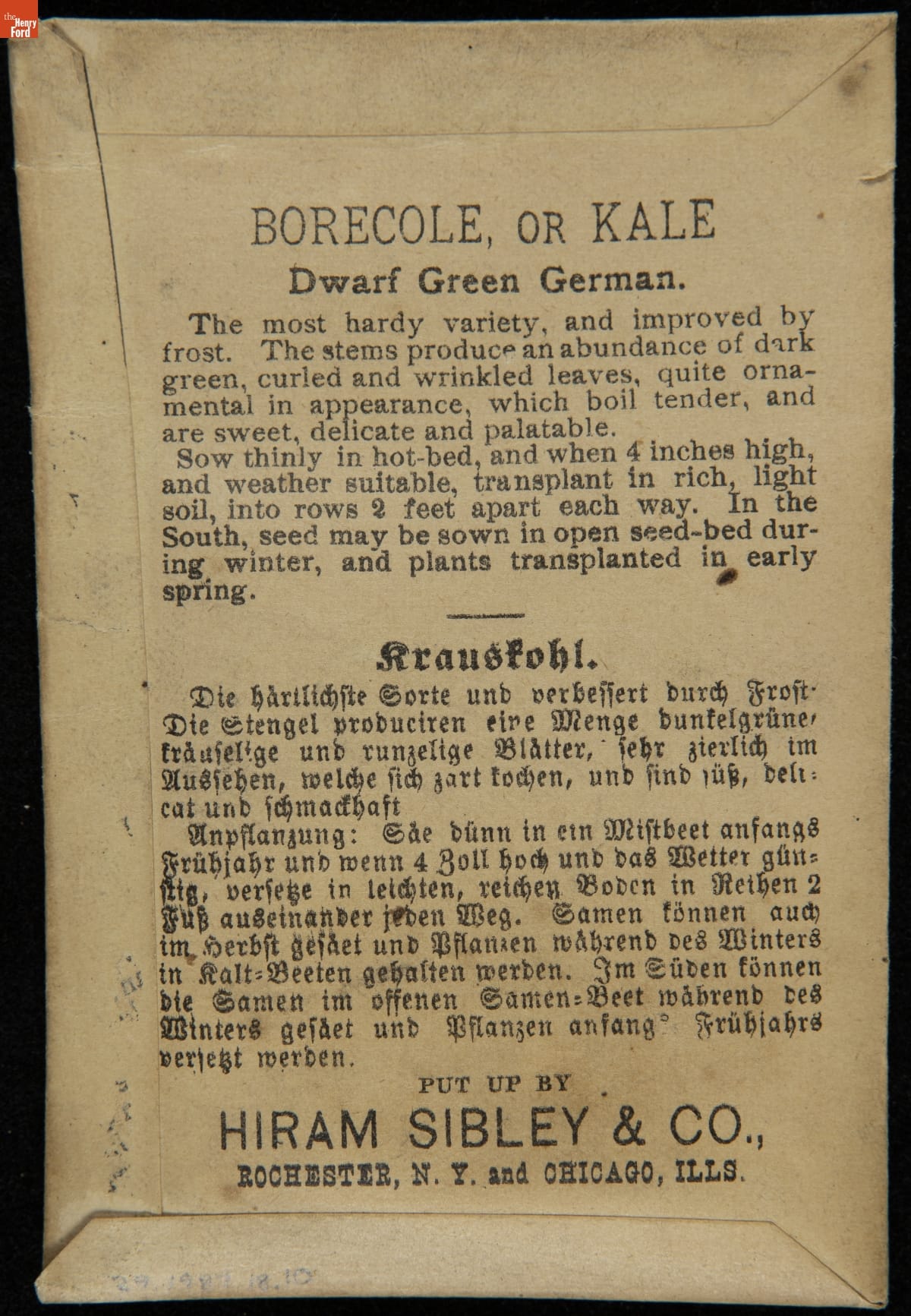on front: BORECOLE or KALE / DWARF GREEN GERMAN / SEND FOR OUR ILLUSTRATED CATALOGUE... / HIRAM SIBLEY & CO. / ROCHESTER, N.Y. & CHICAGO, ILL.