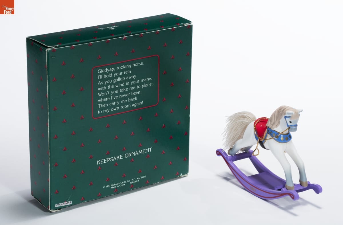 Giddyap, rocking horse / I'll hold your rein / As you gallop away / with the wind in your mane. / Won't you take me to places / where I've never been, / Then carry me back / to my own room again! / KEEPSAKE ORNAMENT / (c) 1987 Hallmark Cards, Inc., K.C., Mo. 64141 / Made in China QX485-9