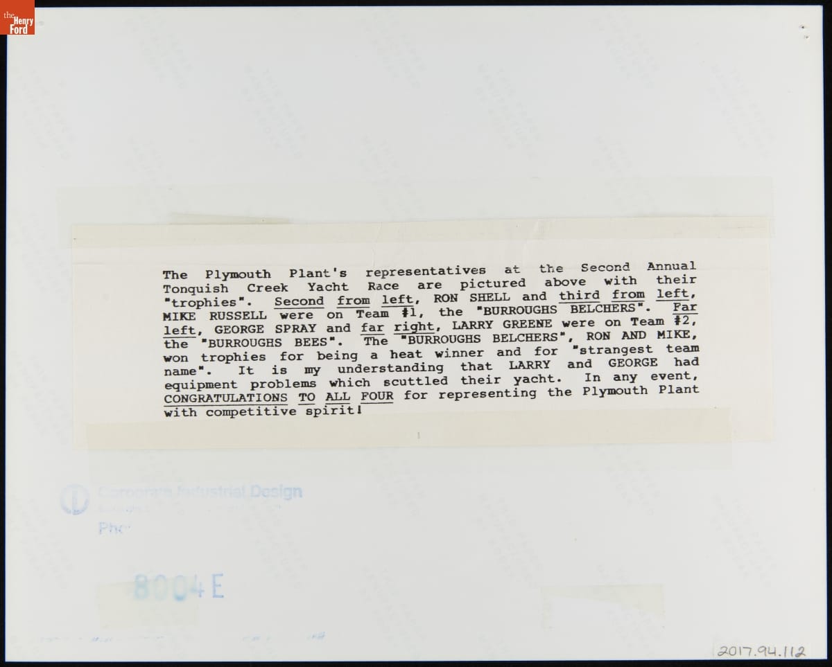 Plymouth Plant's Representatives at the Second Annual Tonquish Creek Yacht Race with their Trophies, 1984