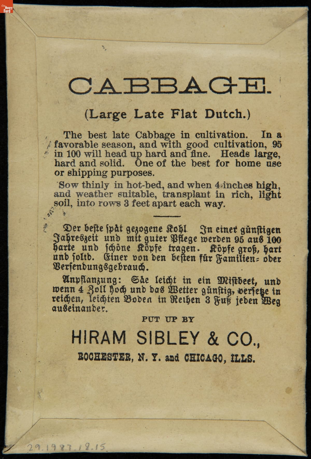 on front: CABBAGE / LARGE LATE FLAT DUTCH / SEND FOR OUR ILLUSTRATED CATALOGUE... / HIRAM SIBLEY & CO. / ROCHESTER, N.Y. & CHICAGO, ILL.