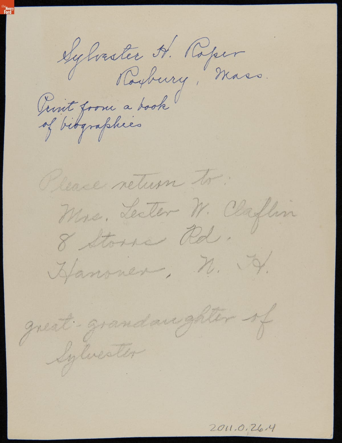 on back of print: (handwritten) Sylvester H. Roper / Roxbury, Mass. / Print from a book / of biographies / Please return to: / Mrs. Lester W. Claflin / 8 Storrs Rd. / Hanover, N.H. / great-granddaughter of / Sylvester