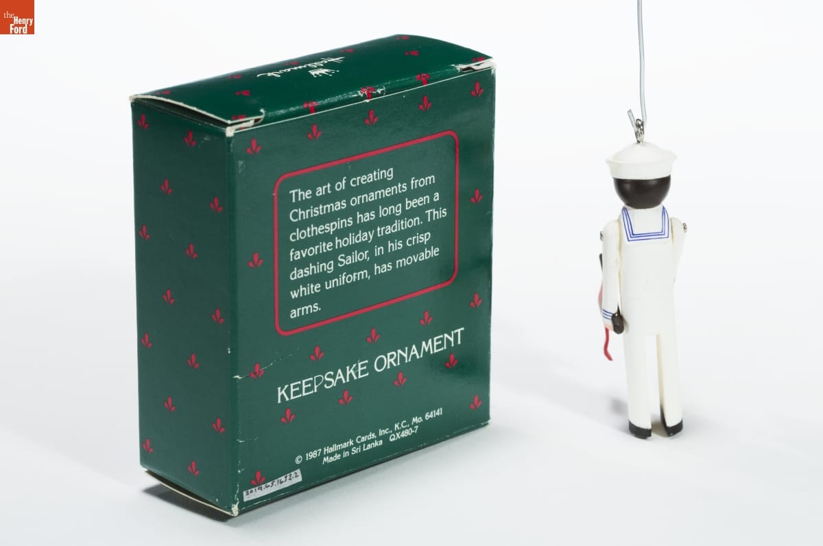 The art of creating / Christmas ornaments from / clothespins has long been a / favorite holiday tradition. This / dashing Sailor, in his crisp / white uniform, has movable / arms. / KEEPSAKE ORNAMENT / (c) 1987 Hallmark Cards, Inc., K.C., Mo. 64141 / Made in Sri Lanka QX480-7