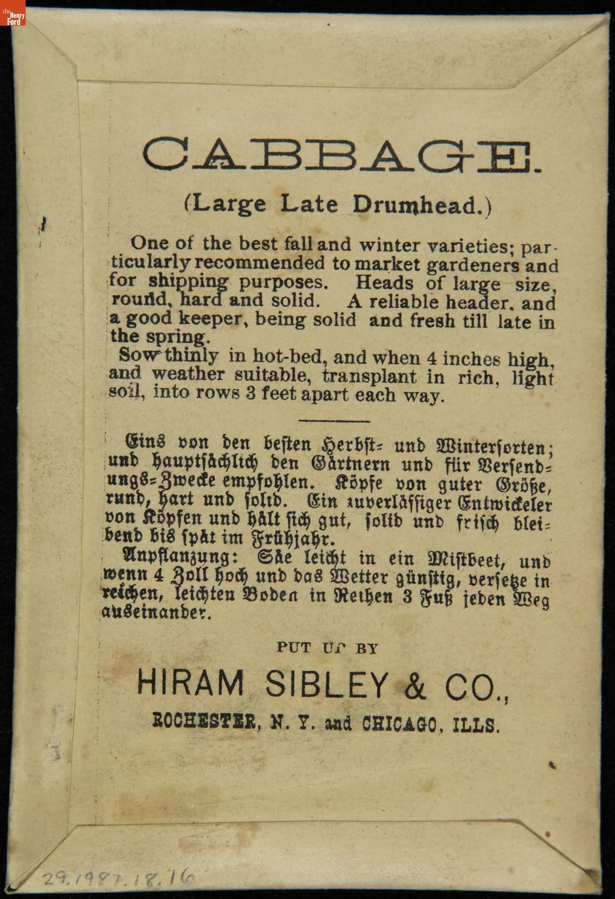 on front: CABBAGE / LARGE LATE DRUMHEAD / SEND FOR OUR ILLUSTRATED CATALOGUE... / HIRAM SIBLEY & CO. / ROCHESTER, N.Y. & CHICAGO, ILL.