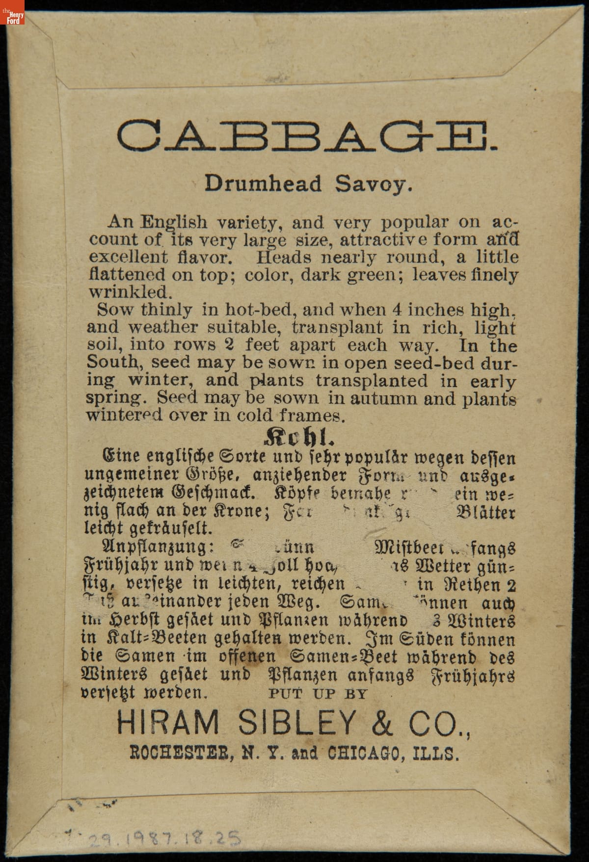 on front: CABBAGE / DRUMHEAD SAVOY / SEND FOR OUR ILLUSTRATED CATALOGUE... / HIRAM SIBLEY & CO. / ROCHESTER, N.Y. & CHICAGO, ILL.