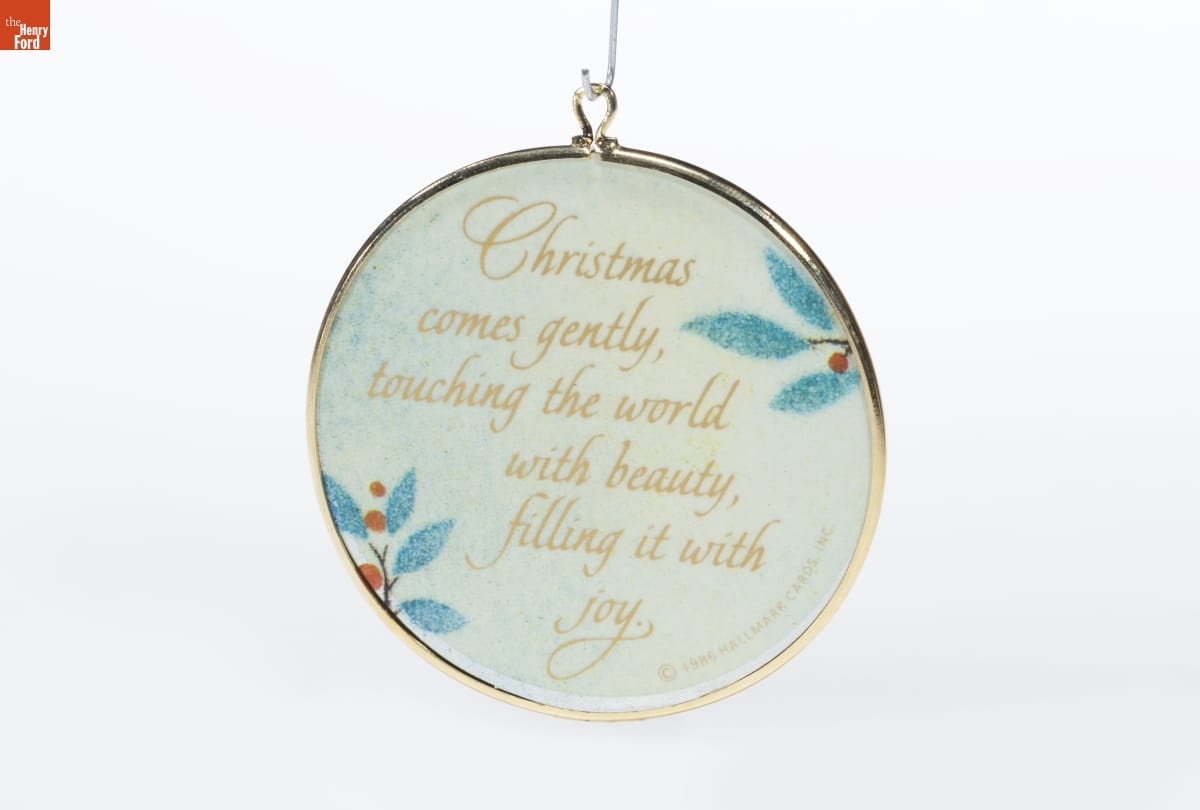 Christmas / comes gently, / touching the world / with beauty, / filling it with / joy. / (C) 1986 HALLMARK CARDS, INC.
