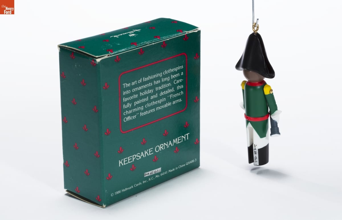 The art of fashioning clothespins / into ornaments has long been a / favorite holiday tradition. Care- / fully painted and detailed, this charming clothespin "French / Officer" features moveable arms. / KEEPSAKE ORNAMENT / (C) 1986 Hallmark Cards, Inc., K.C., Mo. 64141 Made in China QX406-3
