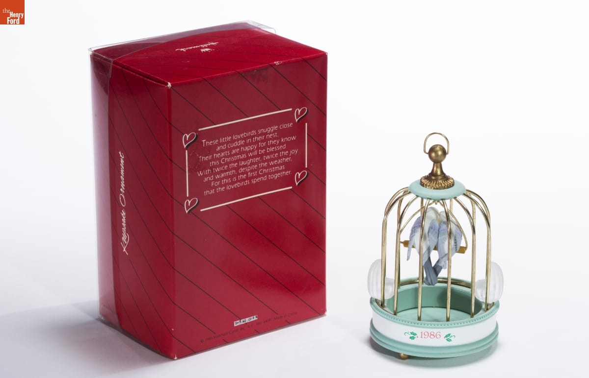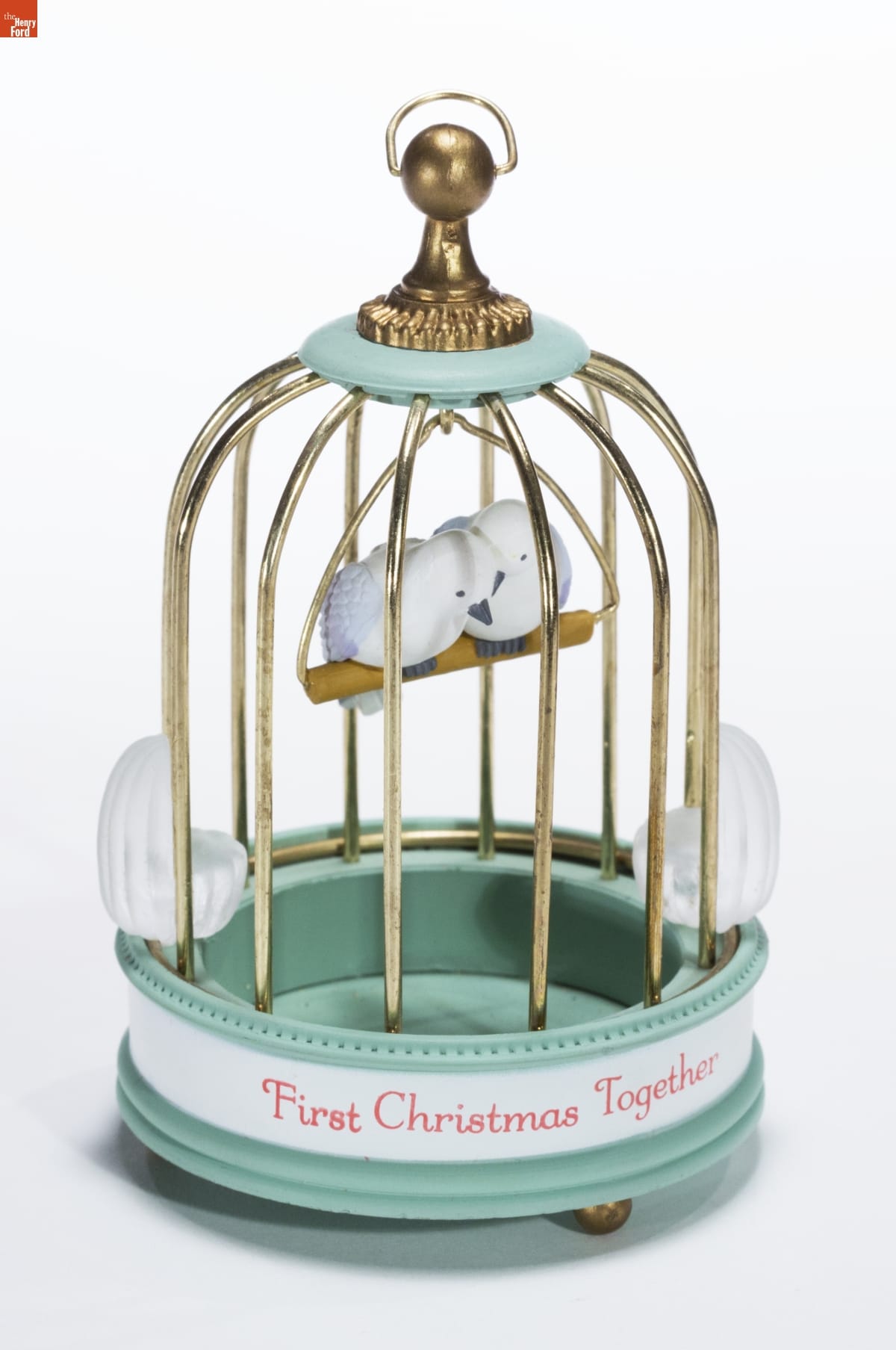 These little lovebirds snuggle close / and cuddle in their nest. / Their hearts are happy for they know / this Christmas will be blessed / With twice the laughter, twice the joy / and warmth, despite the weather, / For this is the first Christmas / that the lovebirds spend together./ (C) 1986 Hallmark Cards, Inc., K.C., Mo. 64141 / Made in China.
