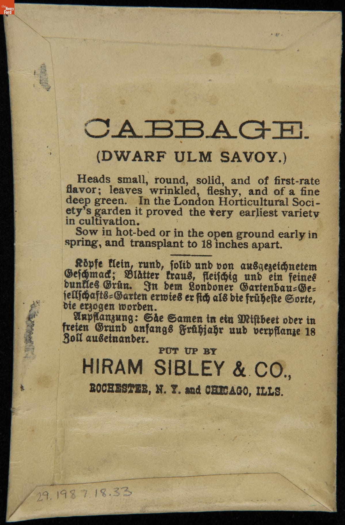 on front: CABBAGE / DWARF ULM SAVOY / SEND FOR OUR ILLUSTRATED CATALOGUE... / HIRAM SIBLEY & CO. / ROCHESTER, N.Y. & CHICAGO, ILL.